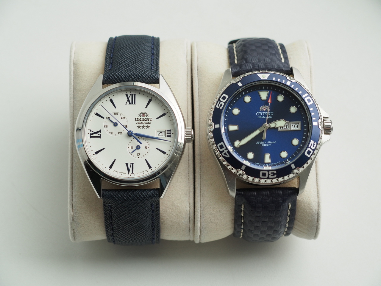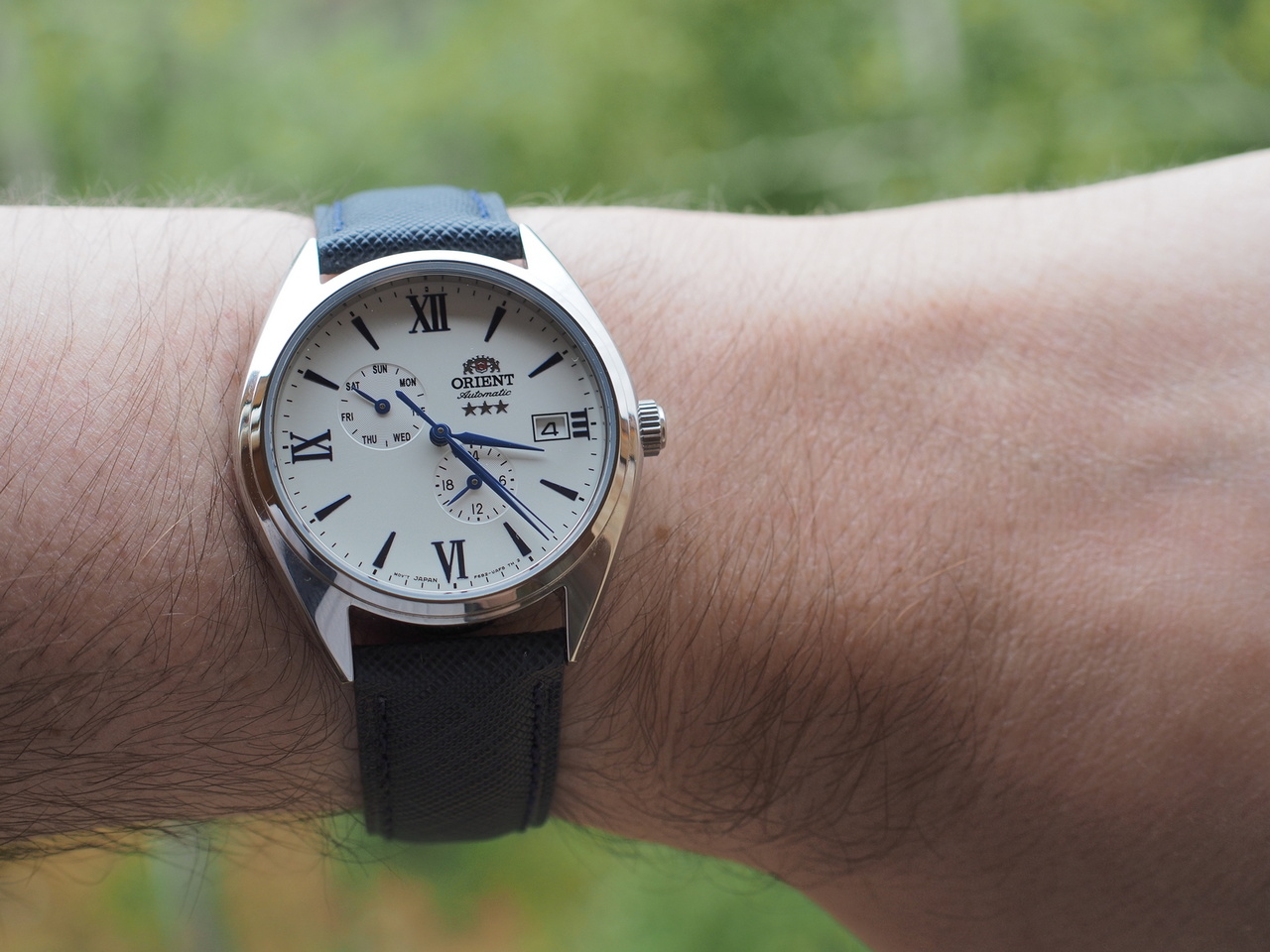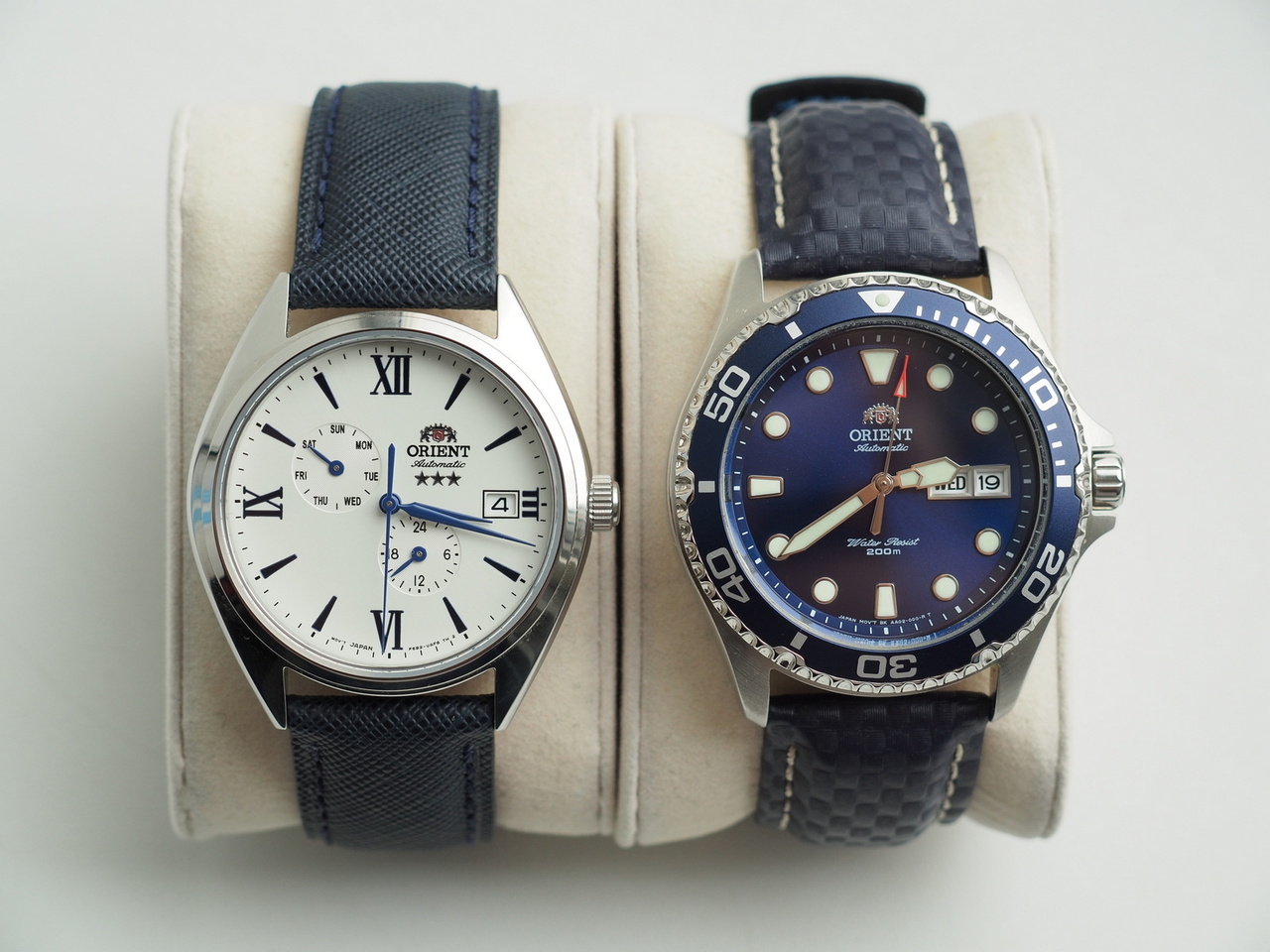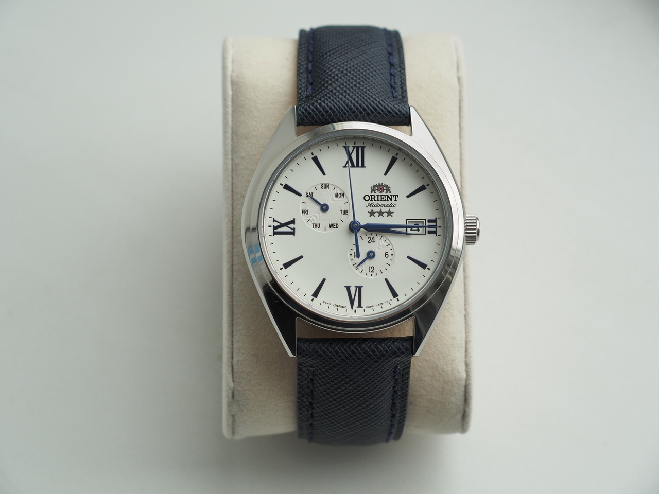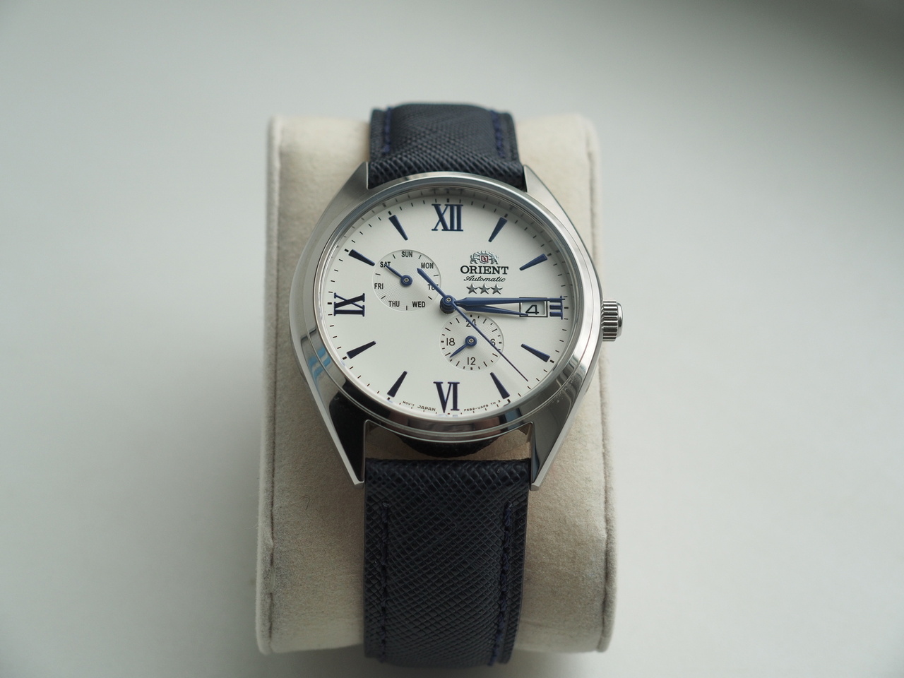 Очень мне все таки хотелось часы на мехе F6B22. У меня уже был Рэй 2 и я видел, что Ориент способен сделать чудесные бюджетные часы. Решение пришло неожиданно, когда просматривал предложения одного известного сингапурского магазина. На фото увидел грустные часы с референсом RA-AK0506S10B. Белый плоский циферблат, темные метки и браслет как из 90-х. Но мех был тот самый. Полез на Ютуб и мне повезло … Американский товарищ уже запилил обзор на Orient Altair Three Stars и это была “бомба” на темно-синем кожаном ремешке!!! Неожиданная скидка 10% не оставила мне шансов и часы были куплены!