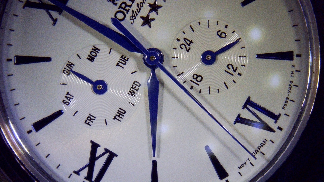 Точность хода у Ориент Альтаир очень хорошая +- 5 сек. в сутки. Ну т.е. в какой-то день они могут отстать на 5 сек, а через пару дней смотришь они уже чуть спешат на 5 сек. За месяц даже не подводил их. Время читается хорошо. Стрелки установлены замечательно - в 6:00 прямая линия, в 12:00 полная соосность. Дата, как водиться у японских механизмов, переползает в период с 22:25 до 23:52. В 23:52 переключается с легким щелчком. День недели переползает в два шага … не знаю в какой период времени. Ночью в общем.