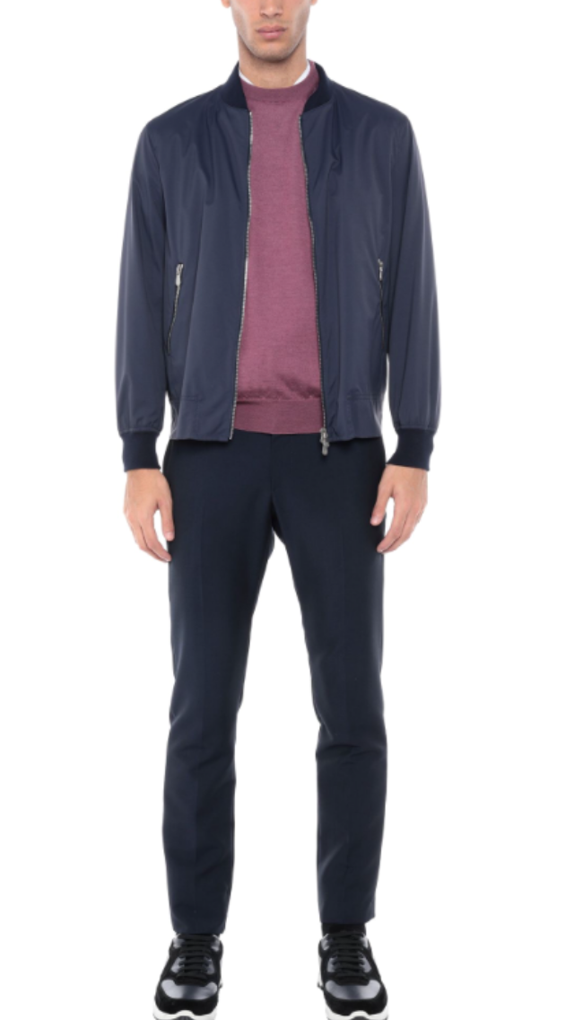 Бомбер выполнен из современной водонепроницаемой нейлоновой ткани насыщенного тёмно-синего цвета.Традиционный фирменный крой Brunello Cucinelli (прямой силуэт,невысокий воротник-стойка,длинные рукава) придаёт модели изысканный характер и элегантность.Куртка застёгивается на прочную металлическую молнию с двумя крупными брендированными бегунками контрастного серебристого цвета.Прорезные карманы по бокам также имеют застёжку на молнию.Нижняя кромка,манжеты втачных рукавов обрамлены хлопковой трикотажной резинкой в тон изделию.Бежевая подкладка с фирменными нашивками бренда,внутренние карманы с застёжкой на пуговицу с названием знаменитой марки.