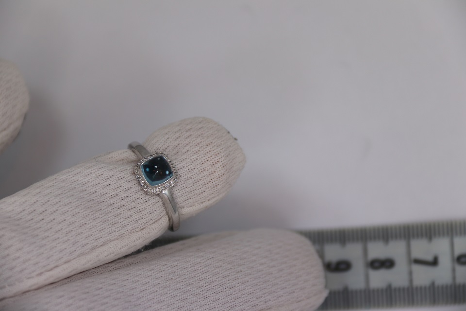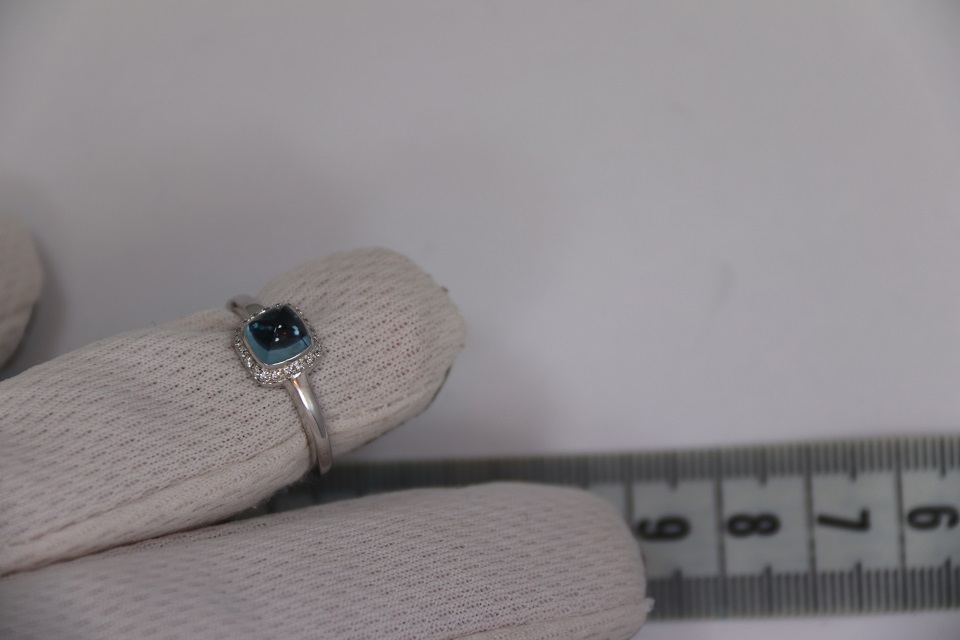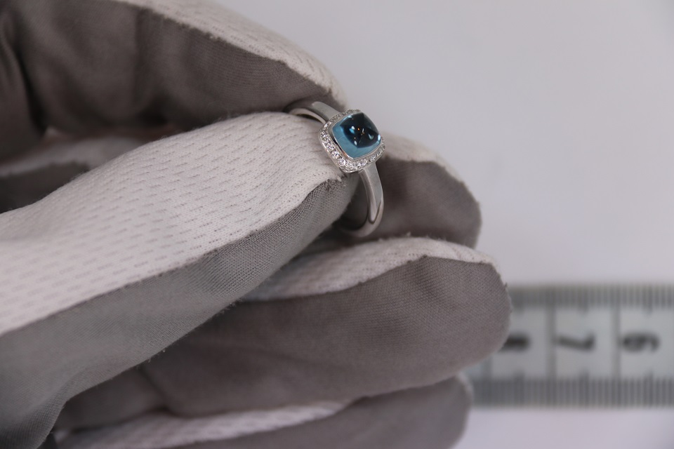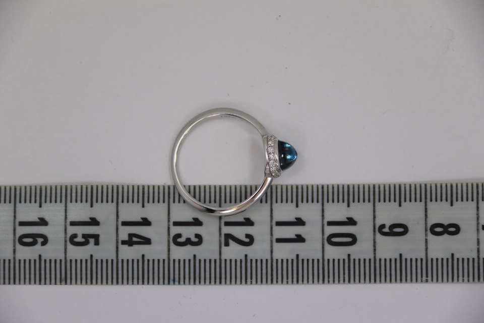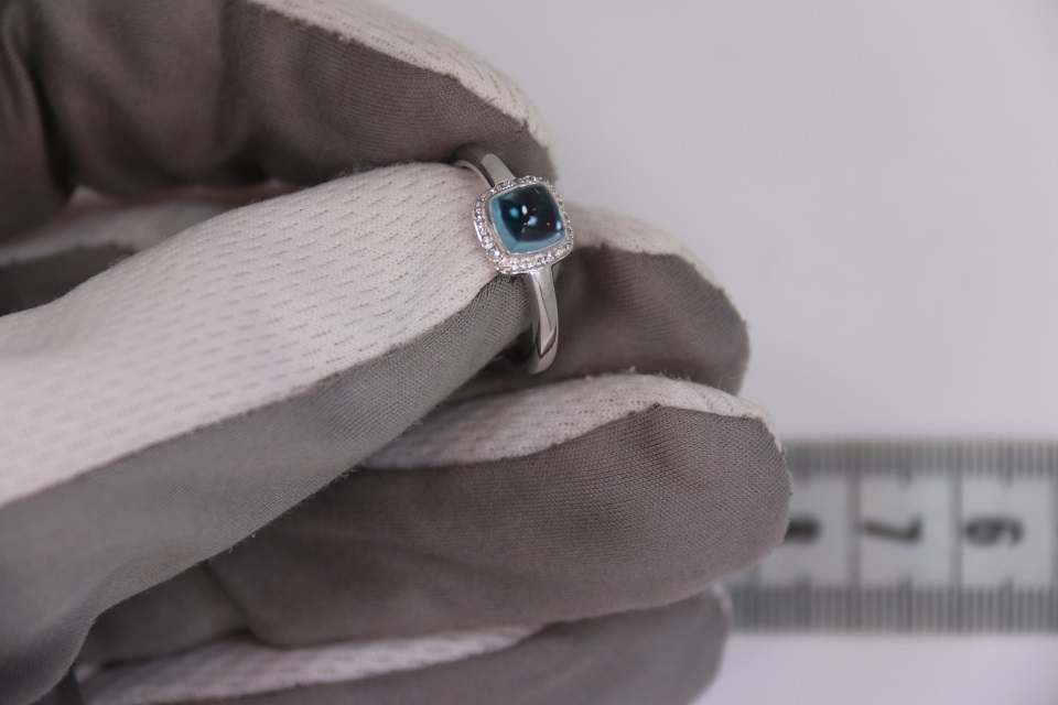 Неспешно продается новое женское золотое бриллиантовое кольцо из 18к белого золота, с бриллиантами и кабошоном из синего топаза
