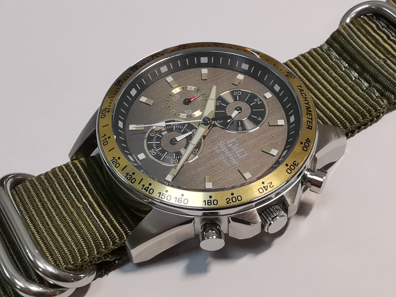 Циферблат графитового цвета, имеет заметное продольно-вертикальное сатинирование, под определенным ракурсом поблескивает. На основном циферблате размещены три малых циферблата. Верхний показывает время в 24х часовом формате, нижний- секундомер, и боковой - счетчик секундомера на 30 минут. Окошка даты к сожалению нет. Малые циферблаты окаймлены золотыми ободочками. Все надписи на циферблате: Q&Q Superior, wr 10 bar, s394j222, выполнены белой краской. Часовые метки накладные, выполнены в виде золотых прямоугольников с нанесенными на верхнюю их половину люминофорными красками, квадратиков по ширине меток.