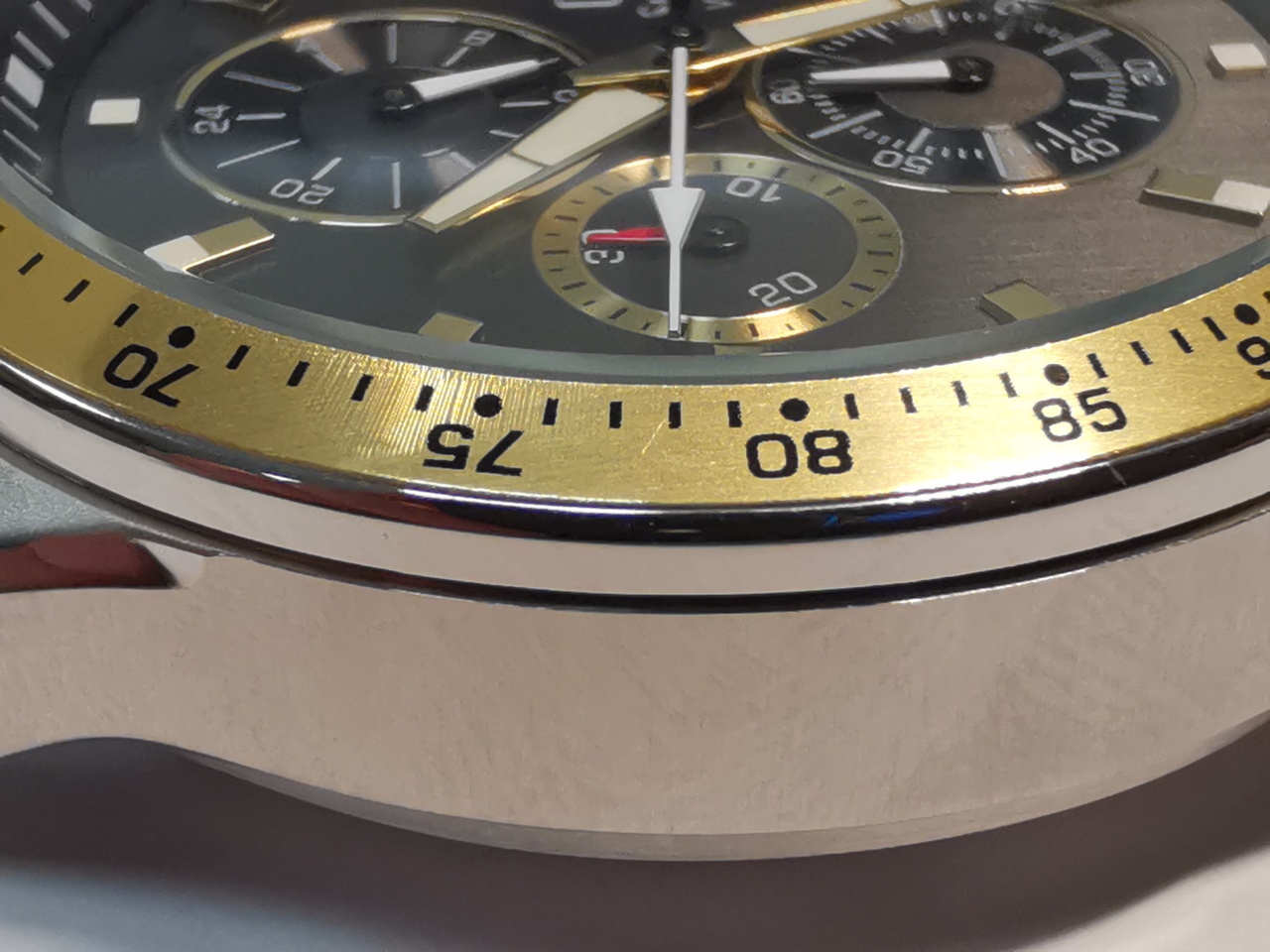 Безель стационарный, полированный. Вставка безеля алюминиевая соломенно-золотого цвета с нанесенной черной краской тахиметрической шкалой. Стекло над циферблатом плоское, минеральное, слегка выступает над безелем.