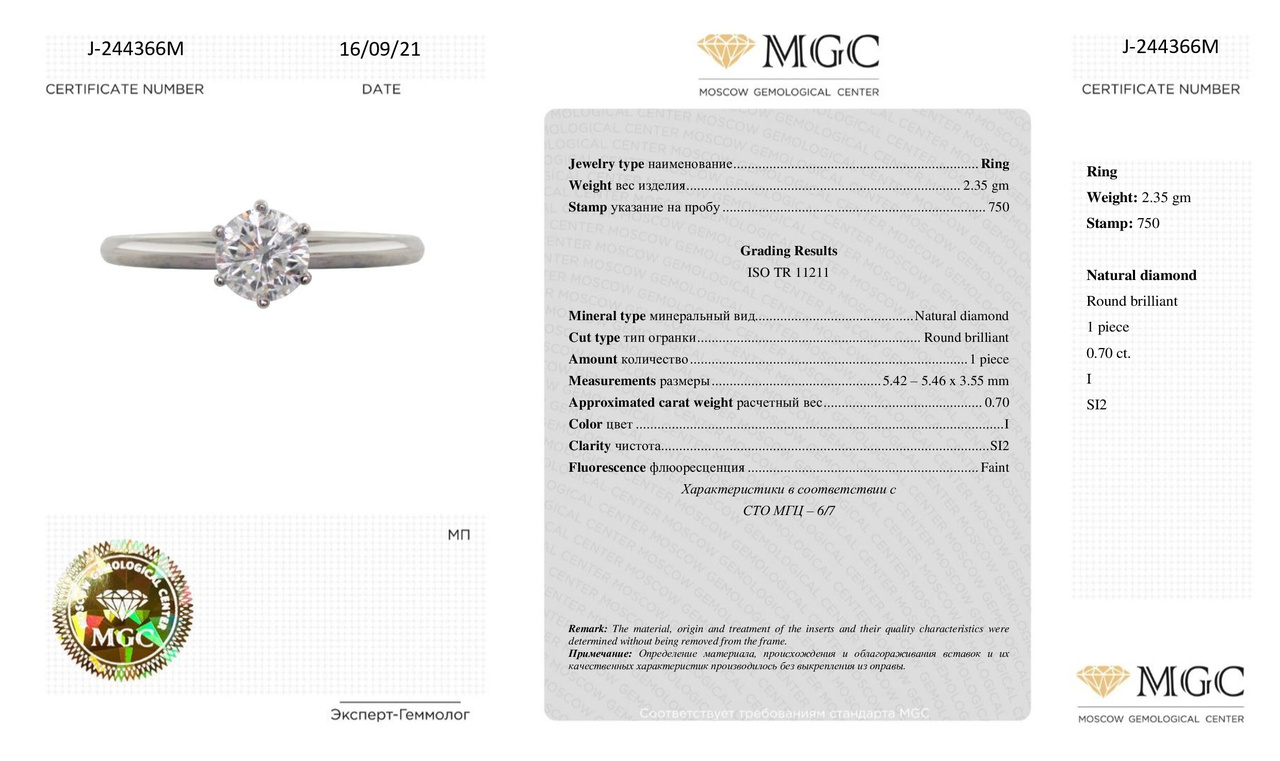 Кольцо из белого золота с бриллиантом 0,7 карат (сертификат МГЦ)