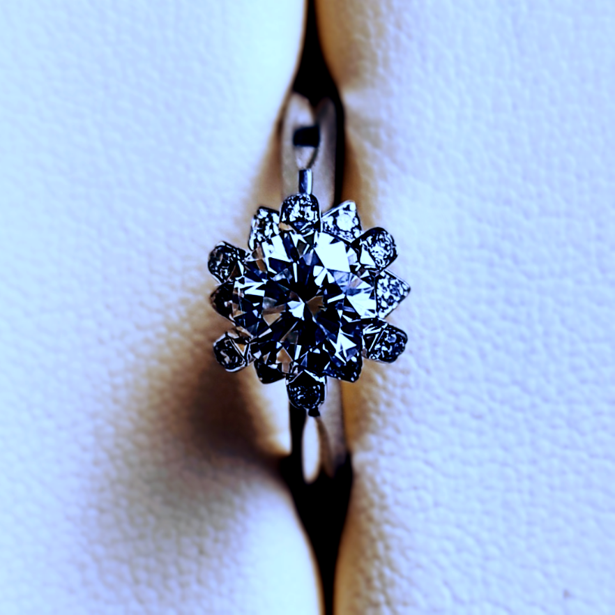 Окружен по кругу в лепестках в два ряда так же природными бриллиантами круглой огранки в количестве 12 штук массой 0,1ct. цветом 3(G) и чистотой (I1).