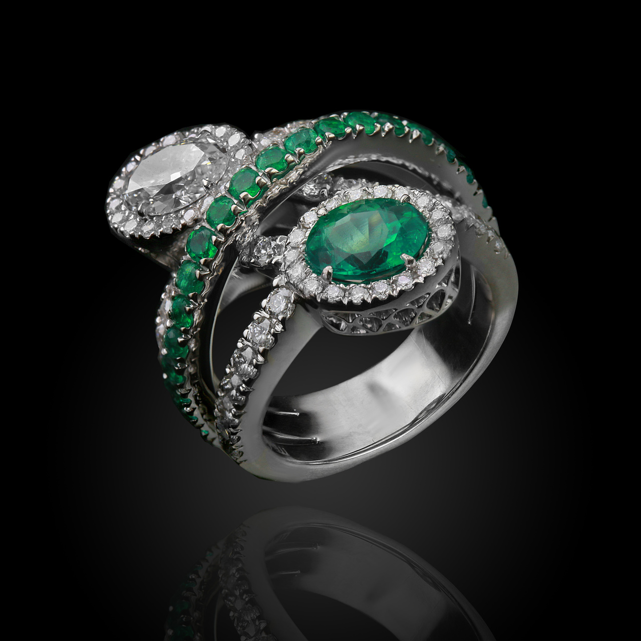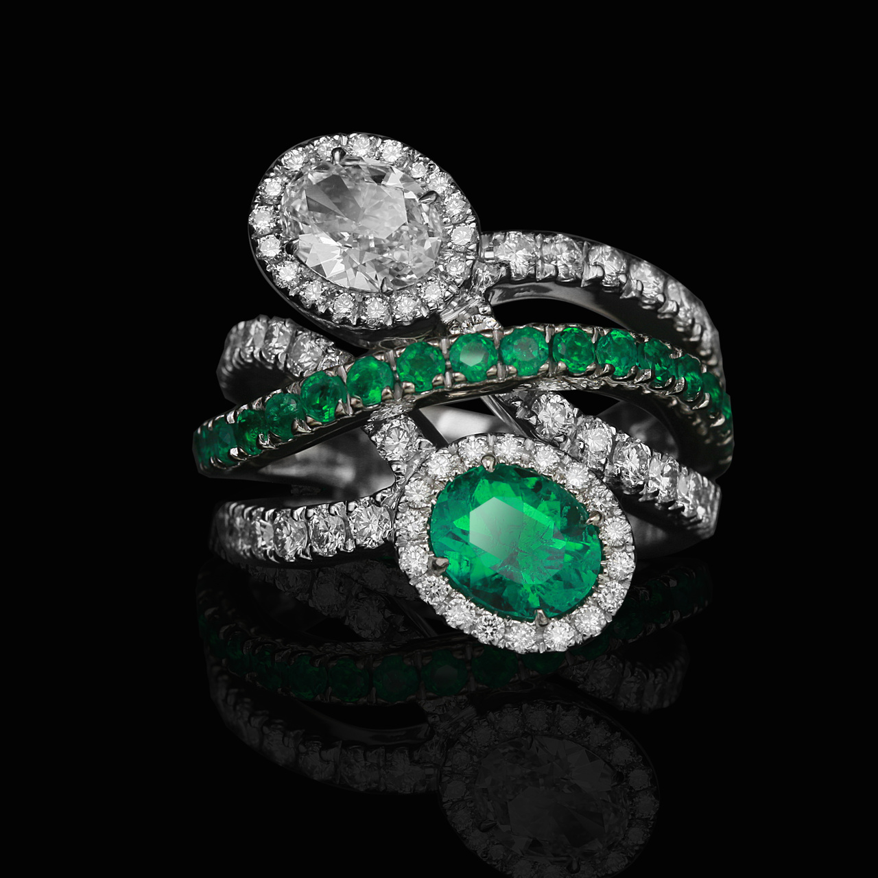 Кольцо из белого золота с изумрудами 1,81 карат и бриллиантами 2,34 карат (сертификат МГЦ)