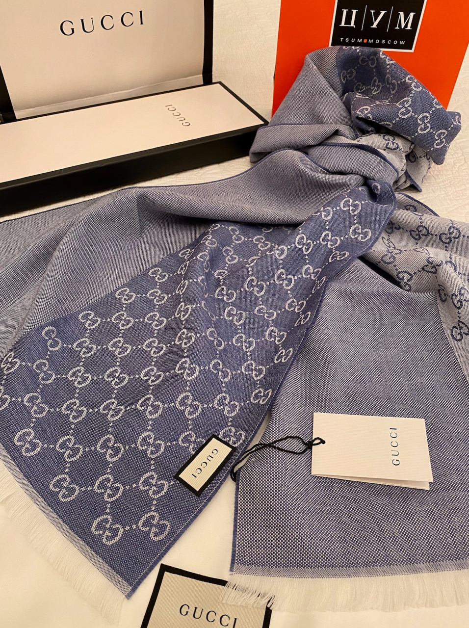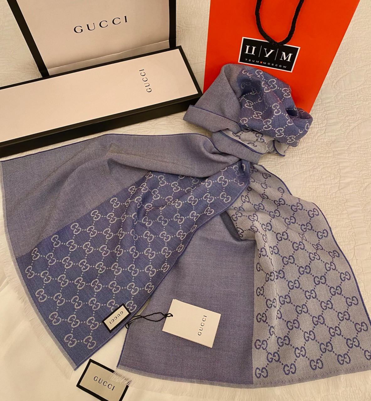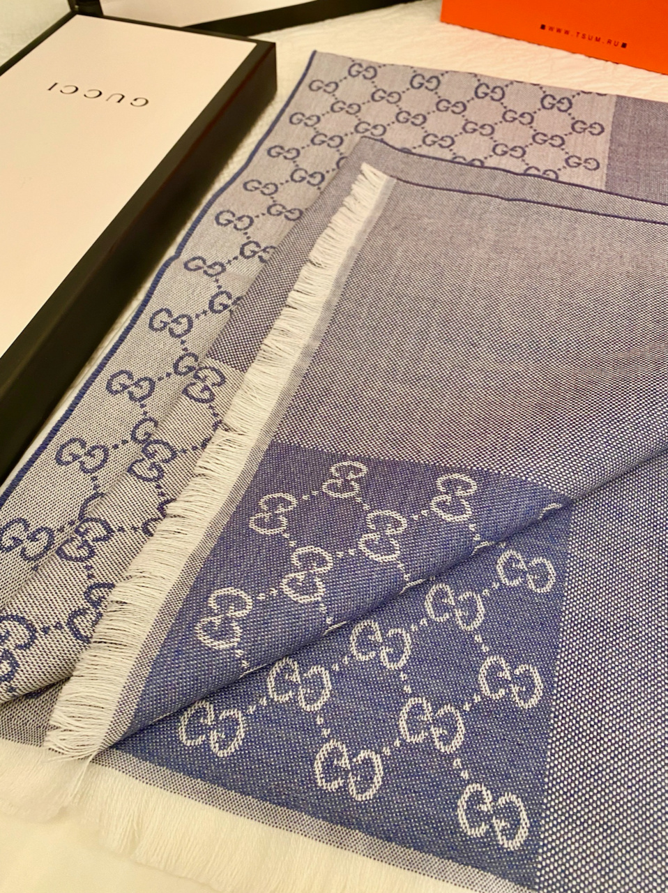 Роскошные цвета - светлый серо-голубой, с рисунком Supreme GG выполненым методом интарсии (двустороннее наложение рисунков). Размер оптимальный - 40 на 180 см, мягкая и теплая мериносовая шерсть 100%. Тонкая 2см бахрома на концах. Все бирки и ярлыки на изделии. Будет классно смотреться с темно-синей и серой одеждой, шарф под любой стиль и возраст.