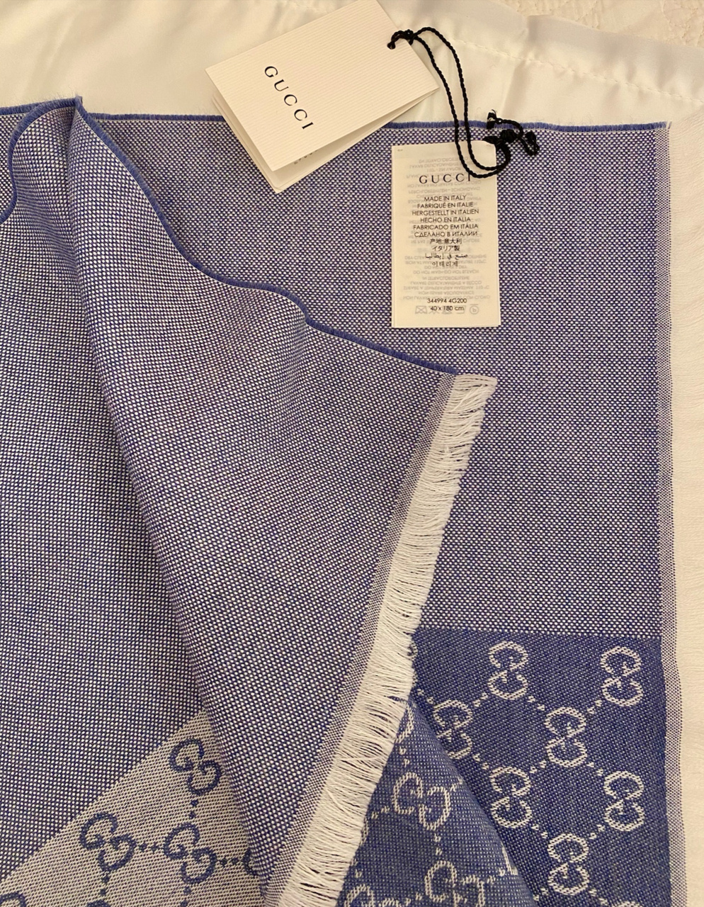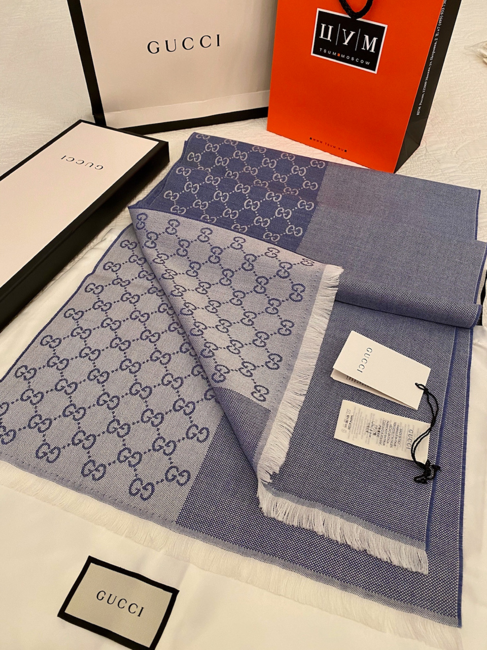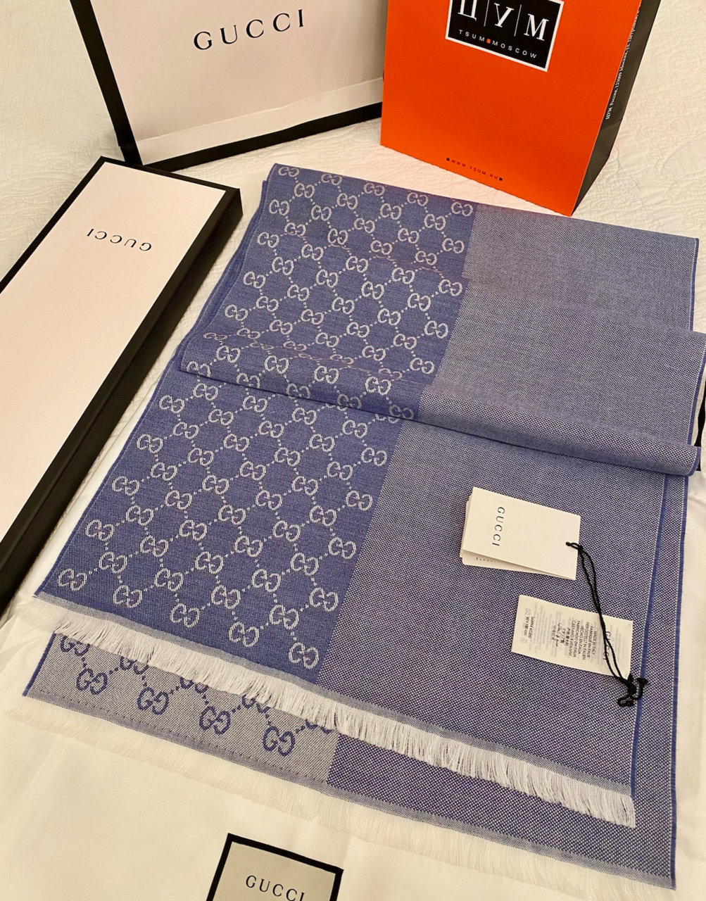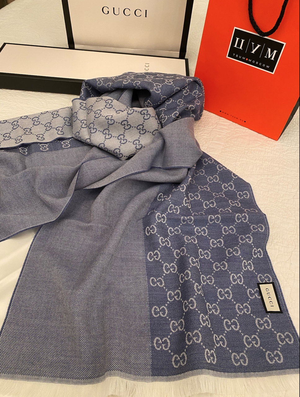Роскошные цвета - светлый серо-голубой, с рисунком Supreme GG выполненым методом интарсии (двустороннее наложение рисунков). Размер оптимальный - 40 на 180 см, мягкая и теплая мериносовая шерсть 100%. Тонкая 2см бахрома на концах. Все бирки и ярлыки на изделии. Будет классно смотреться с темно-синей и серой одеждой, шарф под любой стиль и возраст.