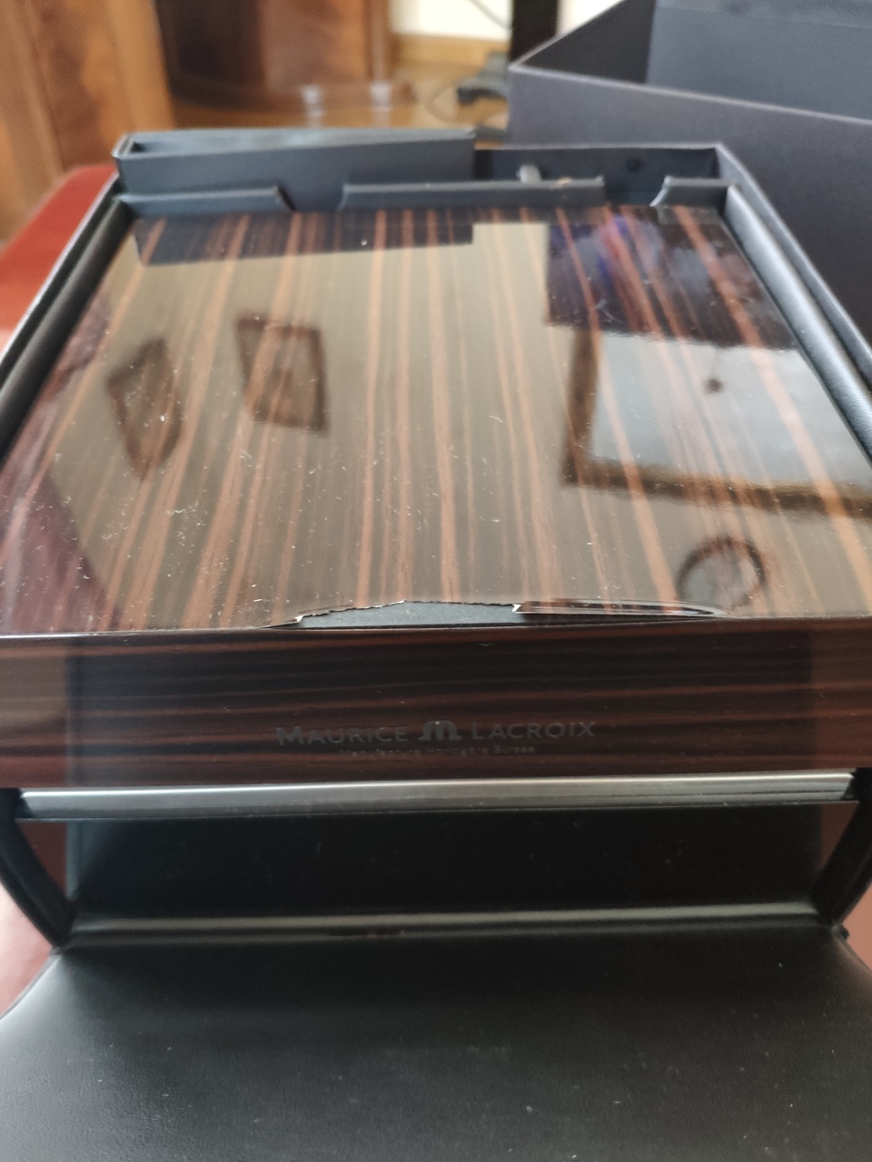 На лакированной коробке на лицевой части есть небольшое отслоение лака (коробка лежала на подоконнике, вероятно отслоение произошло по причине нагрева от солнца).