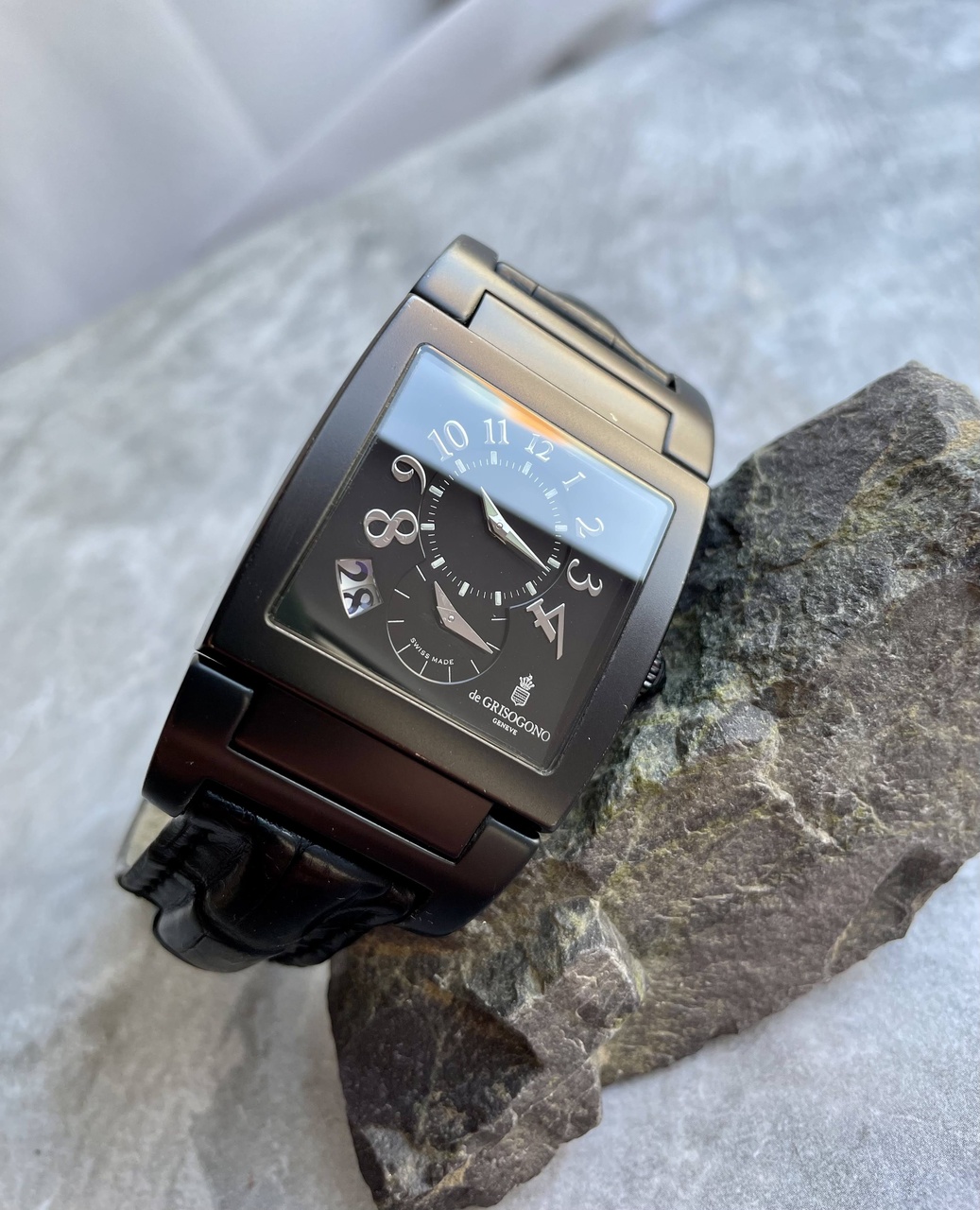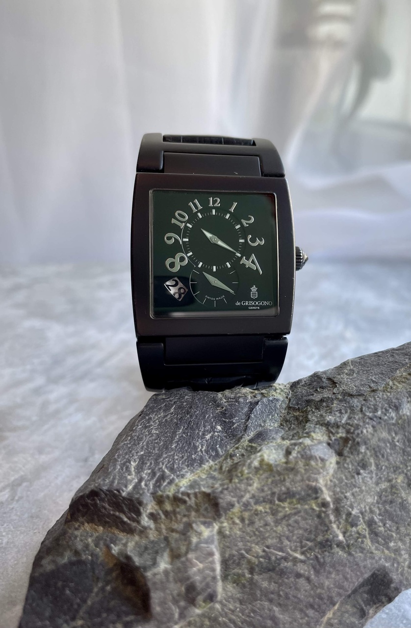 При этом часовой опыт Груози не ограничился только эстетикой. Так как часы обладают даже подсветкой люминофором, что редкость для таких часов, обладает эргономикой. Ведь очень крупный корпус изогнут по руке и стекло и сам металл образуют на запястье идеальную посадку.