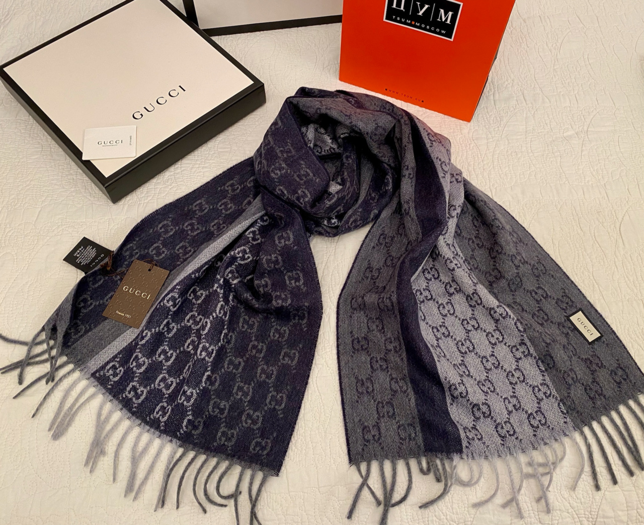Красивый серо-синий цвет с фиалковым оттенком. Знаменитый мотив GG (в честь имени основателя бренда Гуччио Гуччи), фирменная двухцветная лента-Web вдоль всего полотна. Состав 50% кашемир, 50% шерсть. Полотно теплое, на любые морозы и очень приятное на ощупь. Оптимального размера, отлично под пальто, куртку или пуховик. Роскошный шарф, полная подарочная упаковка.