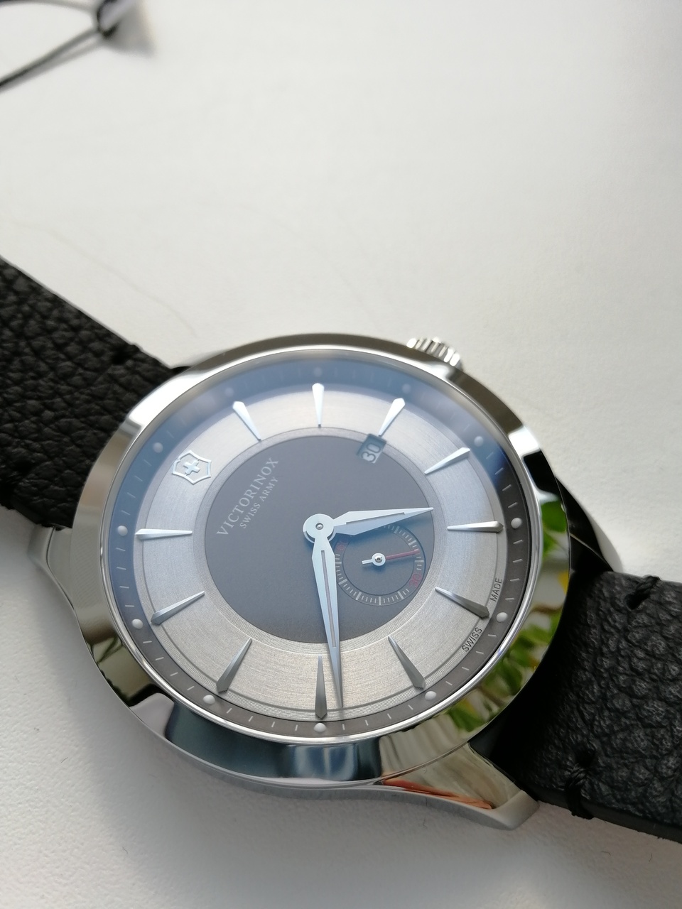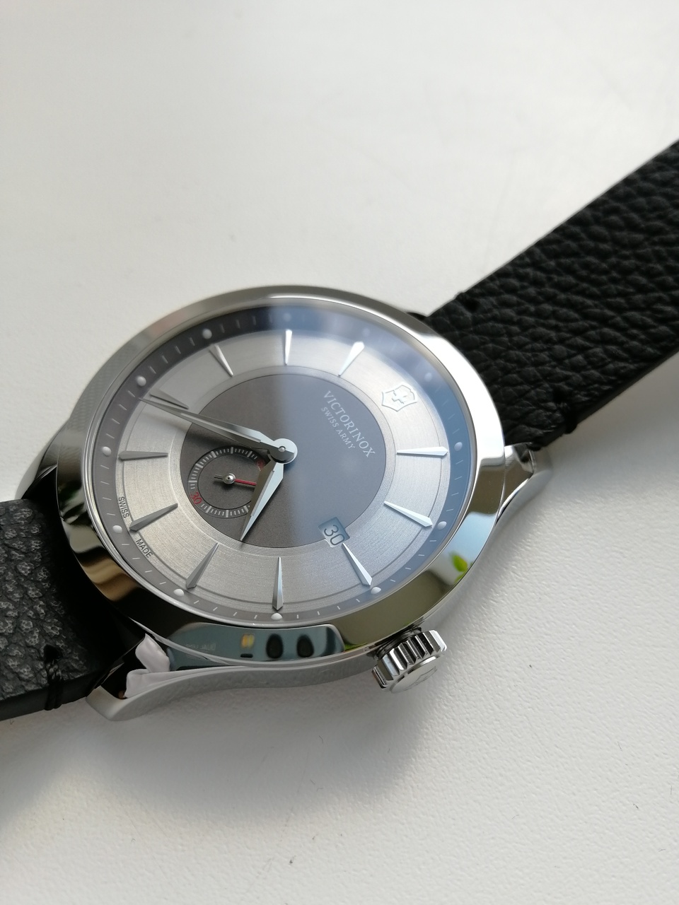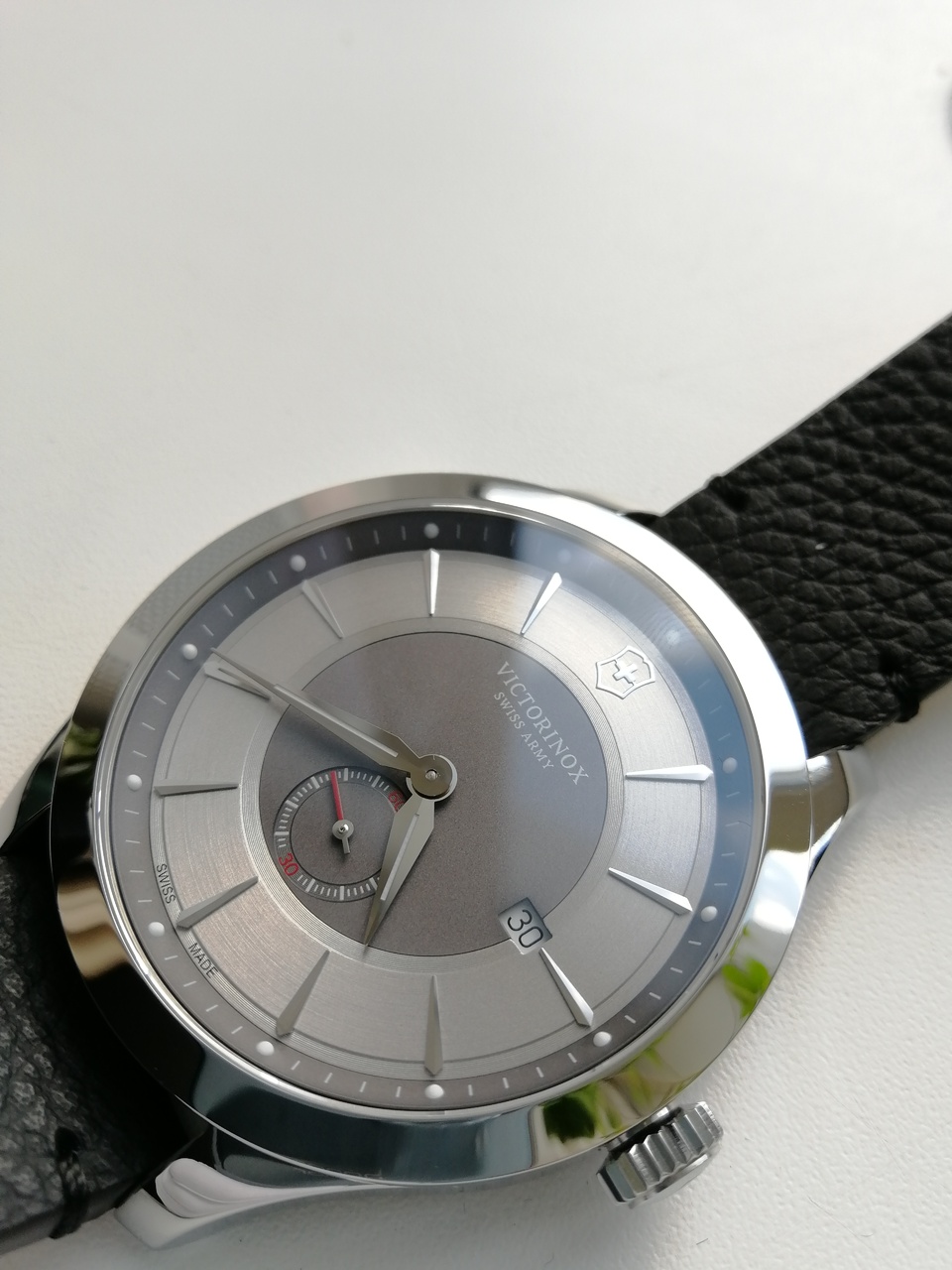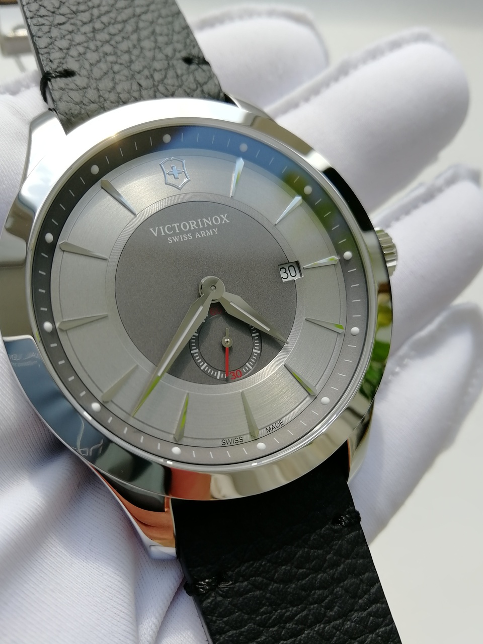 В продаже интересная модель от Victorinox. Очень красивый комбинированный цифер серо-серебристого цвета с накладными элементами, красиво переливающийся на солнце и меняющий оттенки, сапфировое стекло с тройным антибликовым покрытием, отдельно вынесенная малая секундная стрелка, приличный люм и все это в солидном мужском размере корпуса 44 мм.
