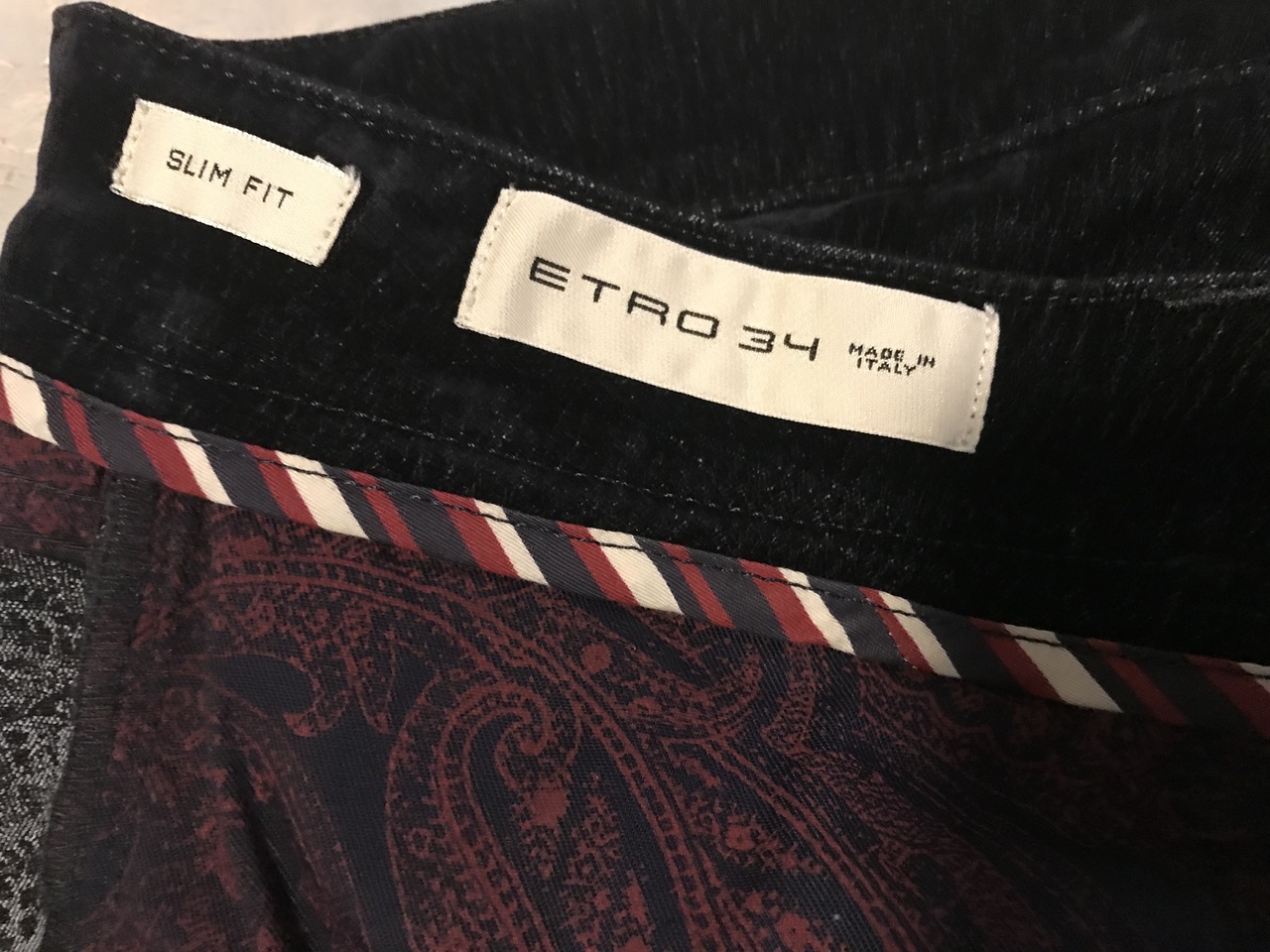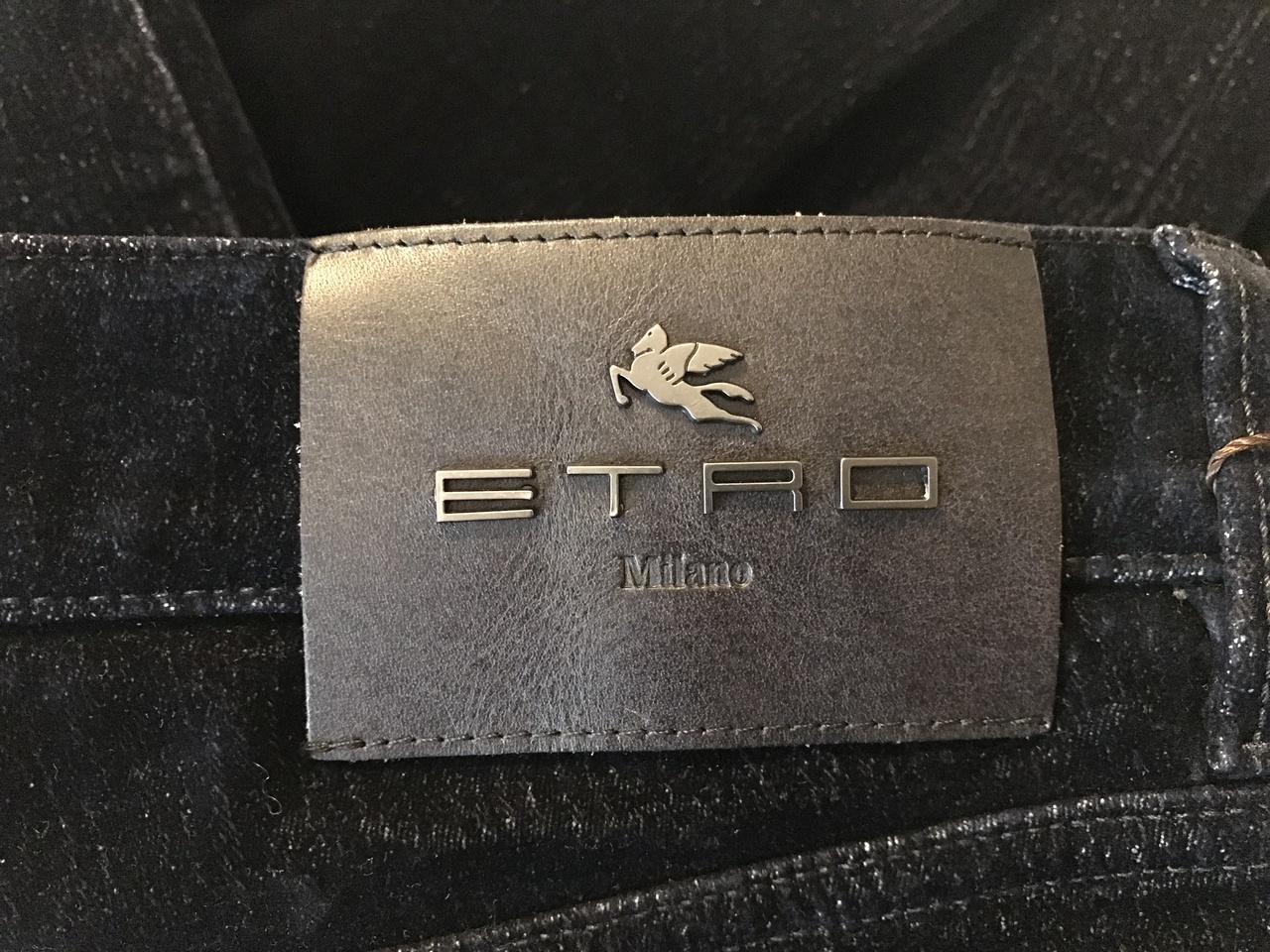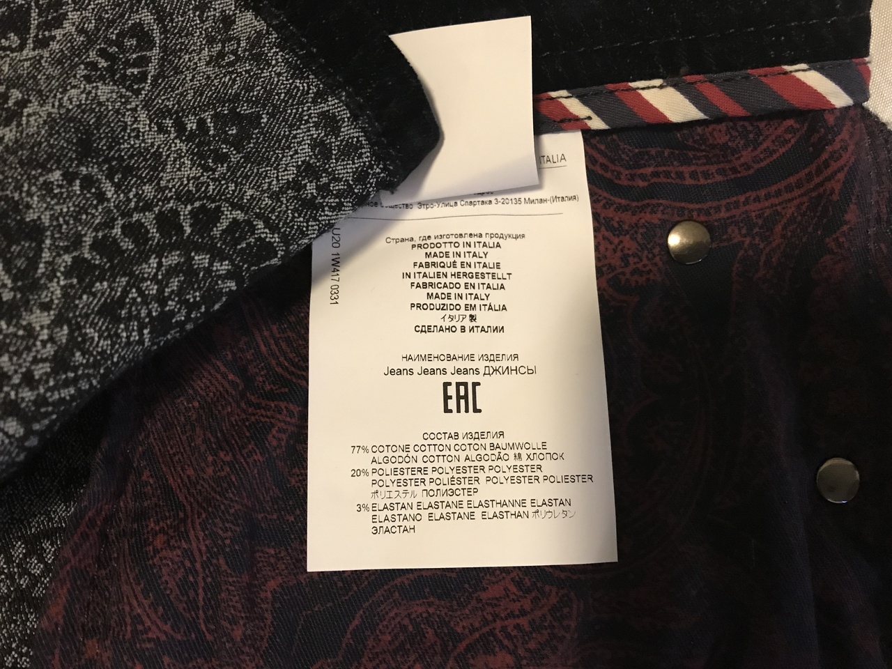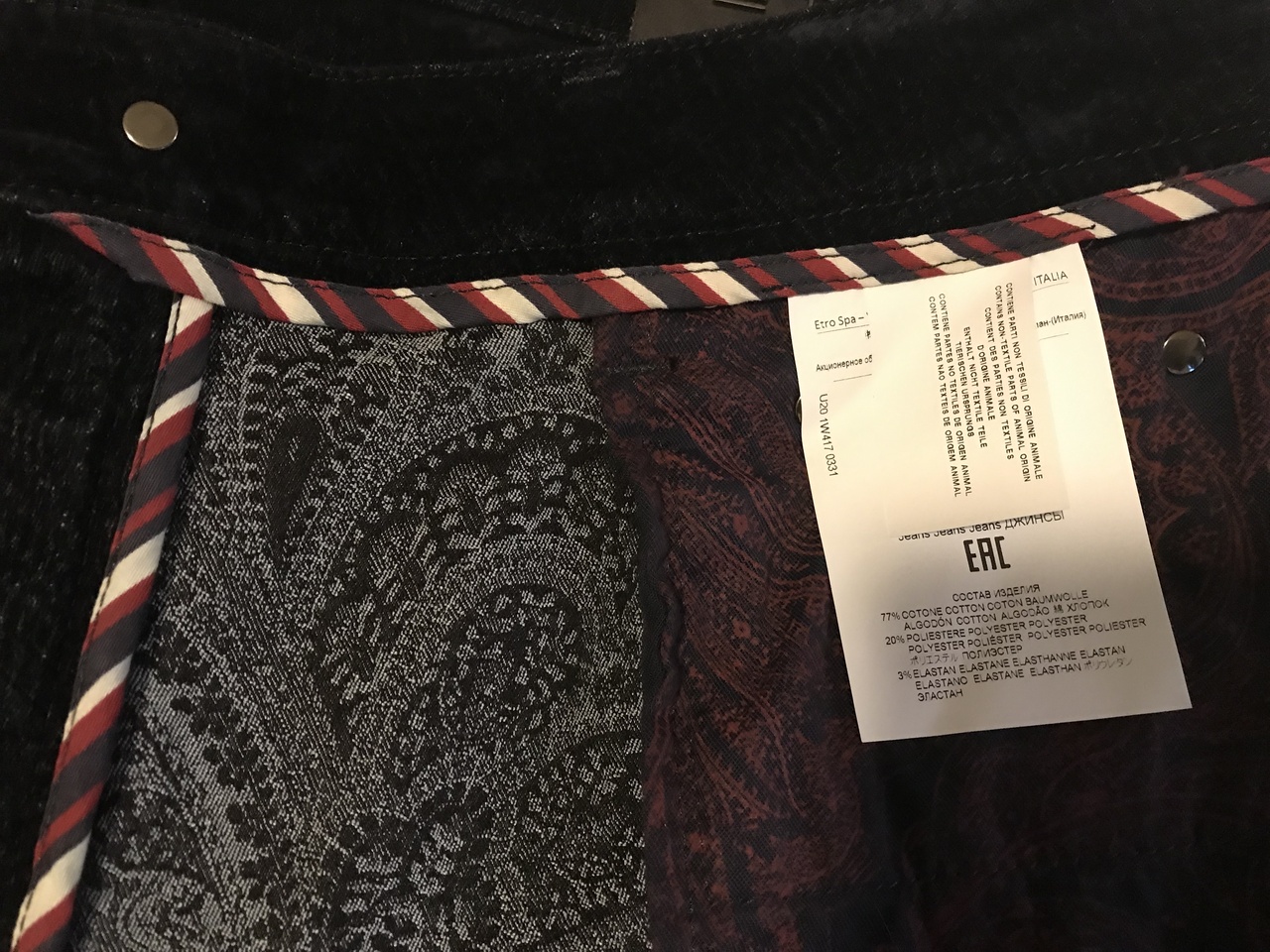 Это не традиционный Деним , который все знают, а именно специальная ткань только у ETRO: с обратной стороны вы можете видеть * опознавательный знак** узор «пэйсли»