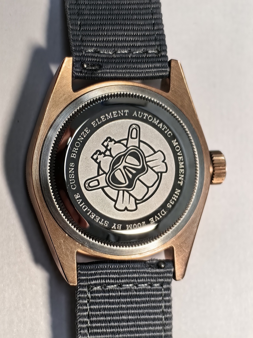 Задняя крышка стальная, завинчивающаяся, похожа на "оригинальную", имеет несколько типов декорирования. У основания сатинирована, на подъёме полирована, и по центру гравирована. По периметру крышки располагаются надписи: By Steeldive, CuSn8, Bronze, Element, Automatic movement,NH35, Dive 200m. В центре крышки находится фирменное изображение логотипа.