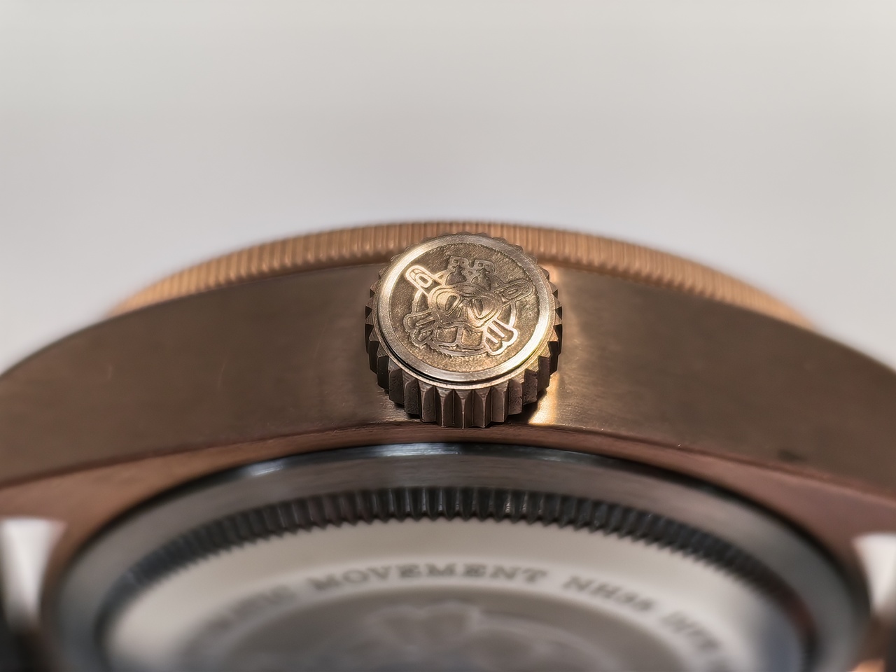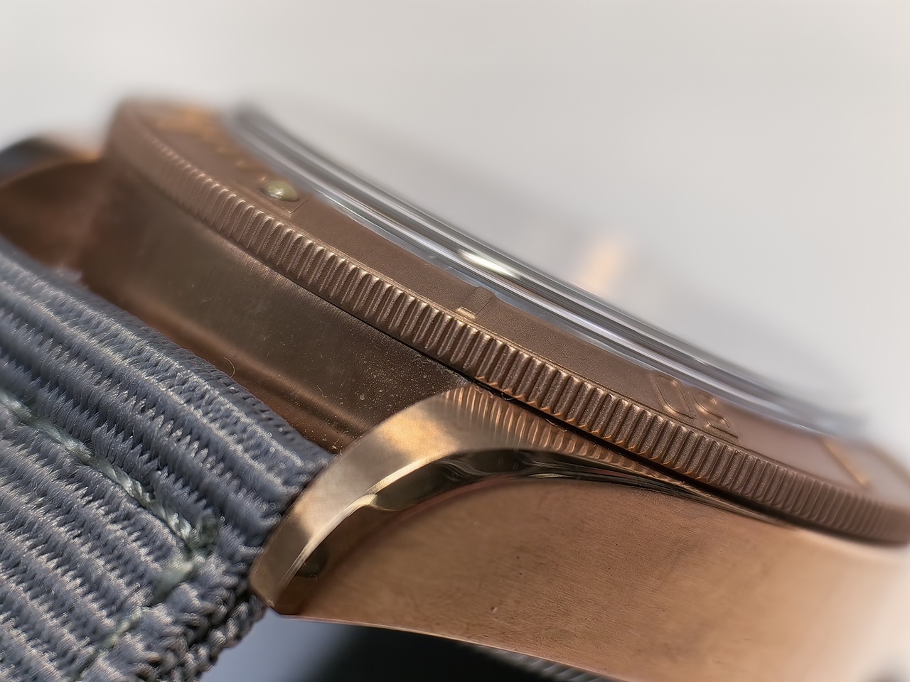 Технические характеристики: Диаметр бронзового корпуса 41мм, с заводной головкой 45мм, от ушка до ушка 50мм, между ушек 22мм, толщина 15мм. Все поверхности корпуса сатинированы, кроме узких фасок по внешним сторонам ушек, - они полированы. Левая и правая стороны корпуса сатинированы тонко-шелковисто, очень приятно глазу. Безель классический, при взгляде сбоку кажется тонким, его "гурт" с частыми мелкими зубчиками, тоньше корпуса в 4 раза. Фаски нет, но безель при этом не цепляется за одежду. Вставка безеля металлическая, вероятно бронзовая с матированной поверхностью, на которой рельефно выступают основные минутные обозначения в виде арабских цифр, как на "оригинале", но со слегка "зализанными " кое где у основания.