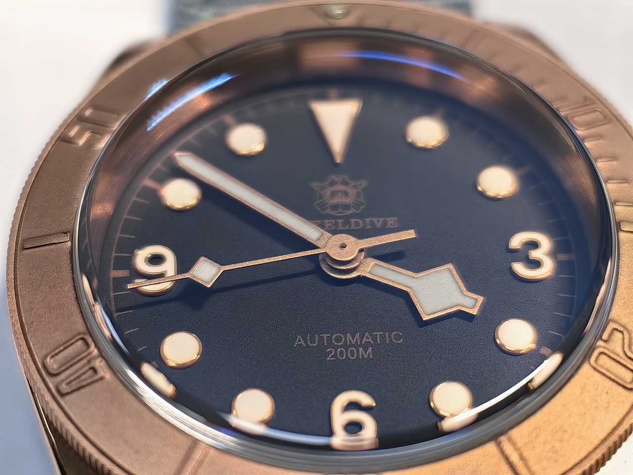 Часы пришли упакованные в стандартный черный кейс(как раньше у Сан Мартина), с инструкциями, без излишеств. Распаковывая от пленок часы, "ВАУ" эффекта я не ощутил, - корпус конечно поблескивал свежестью, но заводная головка уже имела слой патины. Как оказалось, что кроме скромно декорированного безеля, сапфировое стекло имеет покрытие переливающееся различными оттенками синего цвета. Но функционал данного покрытия мне не ясен, - стекло бликует под всеми углами, и считываемость при взгляде прямо на циферблат иногда бывает затруднена отражением потолочных светильников и прочих источников света. И, раз уж я начал с минусов, продолжу - циферблат, хотя и имеет довольно приятный теплый, черный, матовый цвет, но нанесенная по его периметру темно-бронзовой краской минутная разметка,- практически не читаема. Также плохо читаемы и надписи на циферблате: Steeldive, automatic, 200m. , они практически сливаются с цветом поля. На этом минусы не заканчиваются - цвет наполнения люминофором стрелок отличается от цвета наполнения часовых меток, но это ещё полбеды, - отличается интенсивность свечения люминофорного состава. В темноте часовые метки светятся на порядок ярче стрелок. Да, и среди часовых меток нет в этом смысле единства - метки на 3,6,9 часов, выполненные в виде арабских цифр, светятся явно слабее круглых меток. Жемчужина на безеле практически не светится, смысловой нагрузки в ней нет. И, наконец тактильное разочарование мне доставил фирменный ремешок. Он выполнен,- то ли из резины, то ли из пластика, но при застегивании его вокруг запястья, ремешок пытается принять первоначальную форму при его формовании, и "как бы" топорщится. Высокий и тяжелый корпус усиливает негативные стороны резинового ремешка, - часы начинают вращаться вокруг запястья, что неприятно. Пришлось пересадить часы на текстильный ремешок - это существенно помогло.