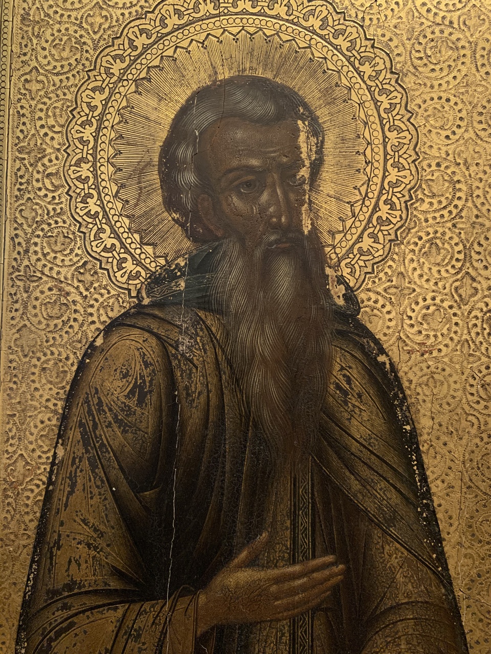 Сохранность: имеются мелкие утраты красочного слоя по краю лика святого. Текст с именами утрачен.