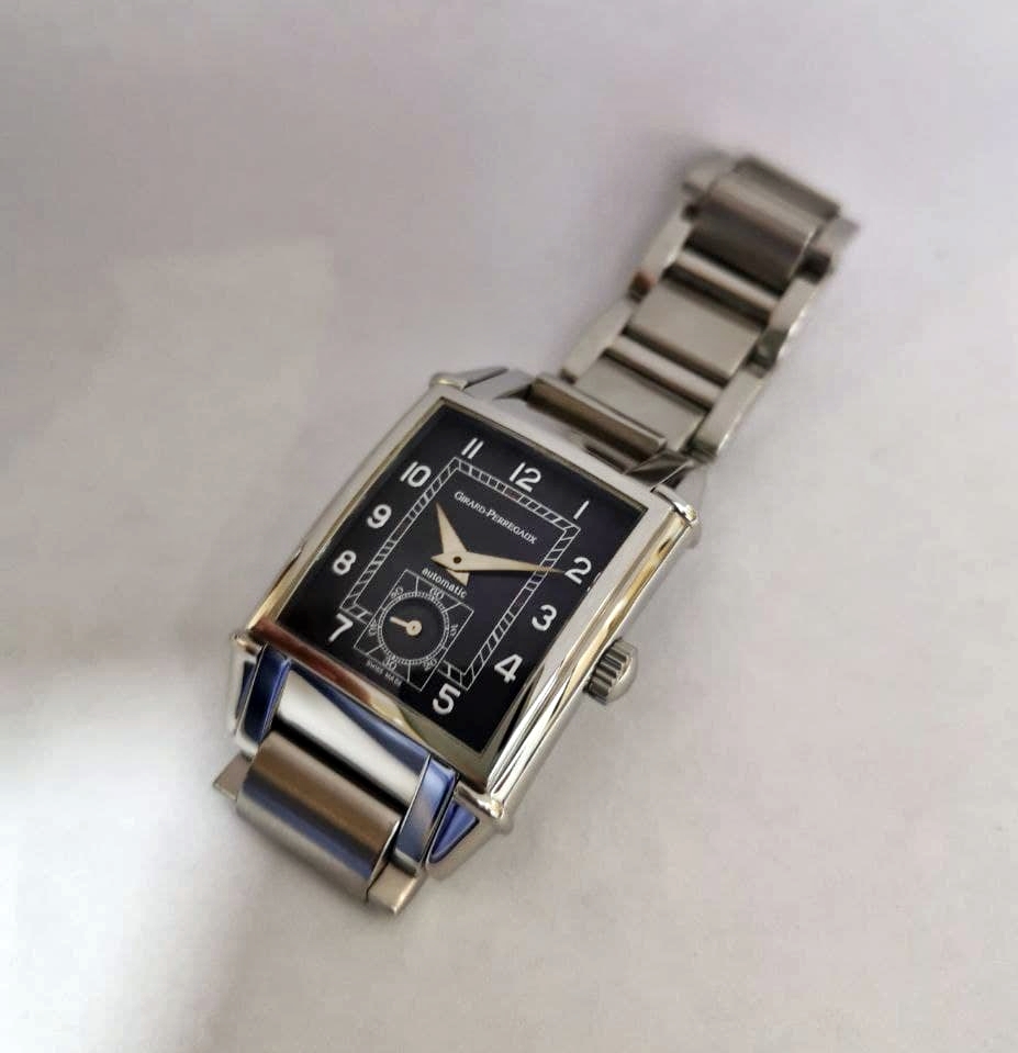 В продаже шикарные часы от Girard Perregaux модель Vintage 1945 в корпусе из нержавеющей полированной стали уже привычной для этой модели квадратной формы в размере корпуса 27*29(42мм с ушками). Браслет на руку до 18см с комфортом. В комплекте только часы (красивую новую часовую коробку подберу).