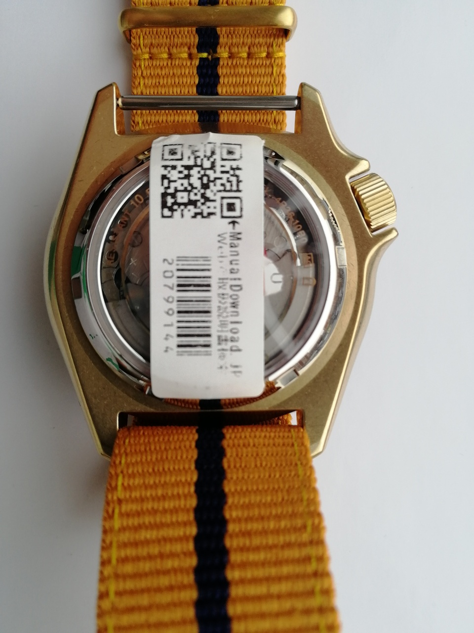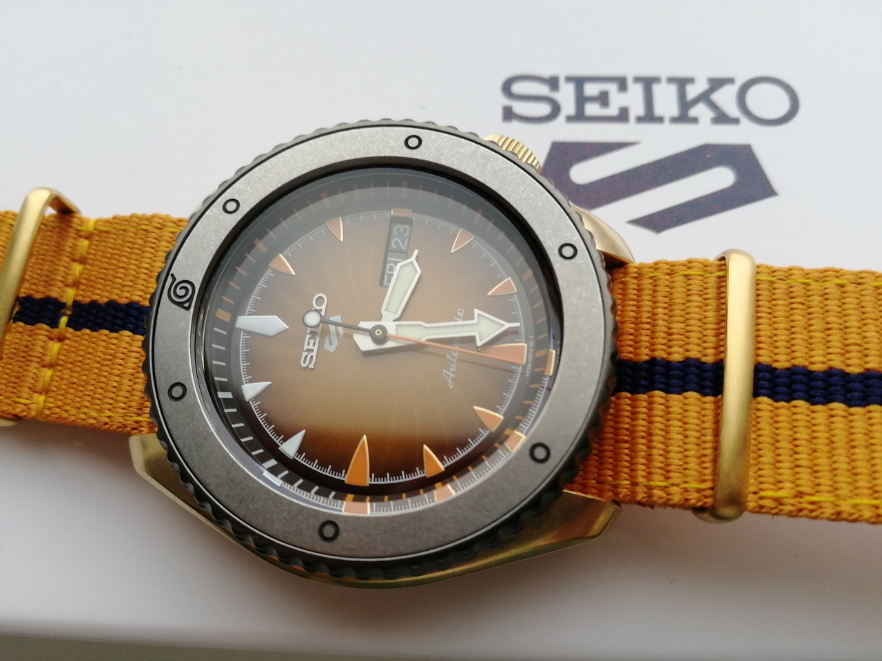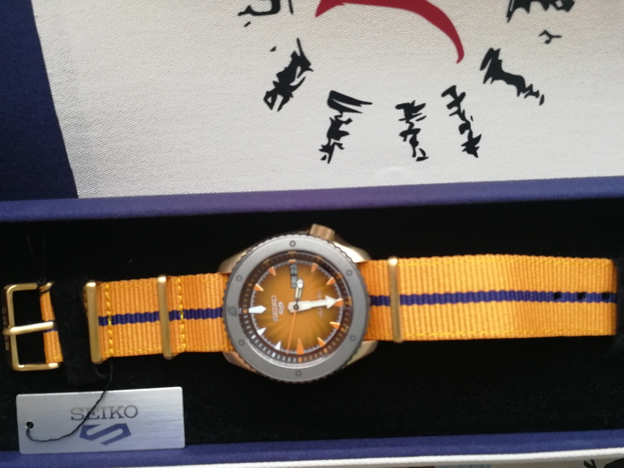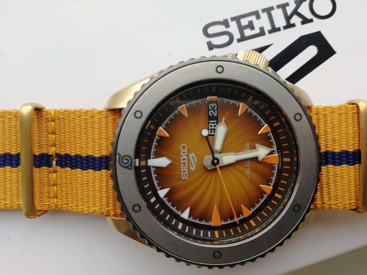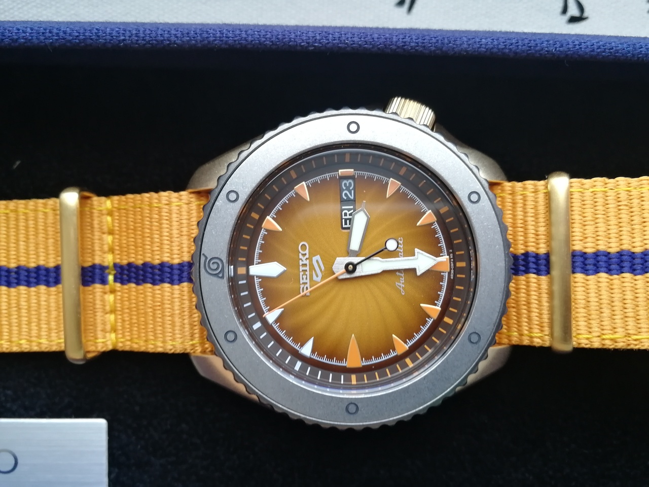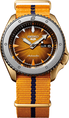 Seiko 5 Sports NARUTO & BORUTO Limited Edition. NARUTO. Мужские механические часы с автоподзаводом (возможность ручного завода). Калибр механизма 4R36. 24 камня. Запас хода примерно 41 час. Функция остановки секундной стрелки. Центральные часовая, минутная и секундная стрелки. Апертура даты и дня недели в позиции 3 часов. Покрытие LumiBrite на стрелках и индексах. Оранжевый циферблат. Круглый корпус выполнен из матовой нержавеющей стали с PVD покрытием цвета желтого золота. Диаметр корпуса составляет 42,5 мм, толщина 13 мм. Однонаправленно вращающийся безель с покрытием. Заводная головка с защитой смещена в положение 4 часов. Оранжевый нейлоновый ремешок, стандартная застежка. Закаленное минеральное стекло Hardlex устойчивое к мелким механическим повреждениям. Прозрачная задняя крышка. Водостойкость WR 100 (плавание без погружения). Вес 96 гр. Лимитированная серия 6 500 экземпляров. Серийный номер выгравирован на задней крышке.