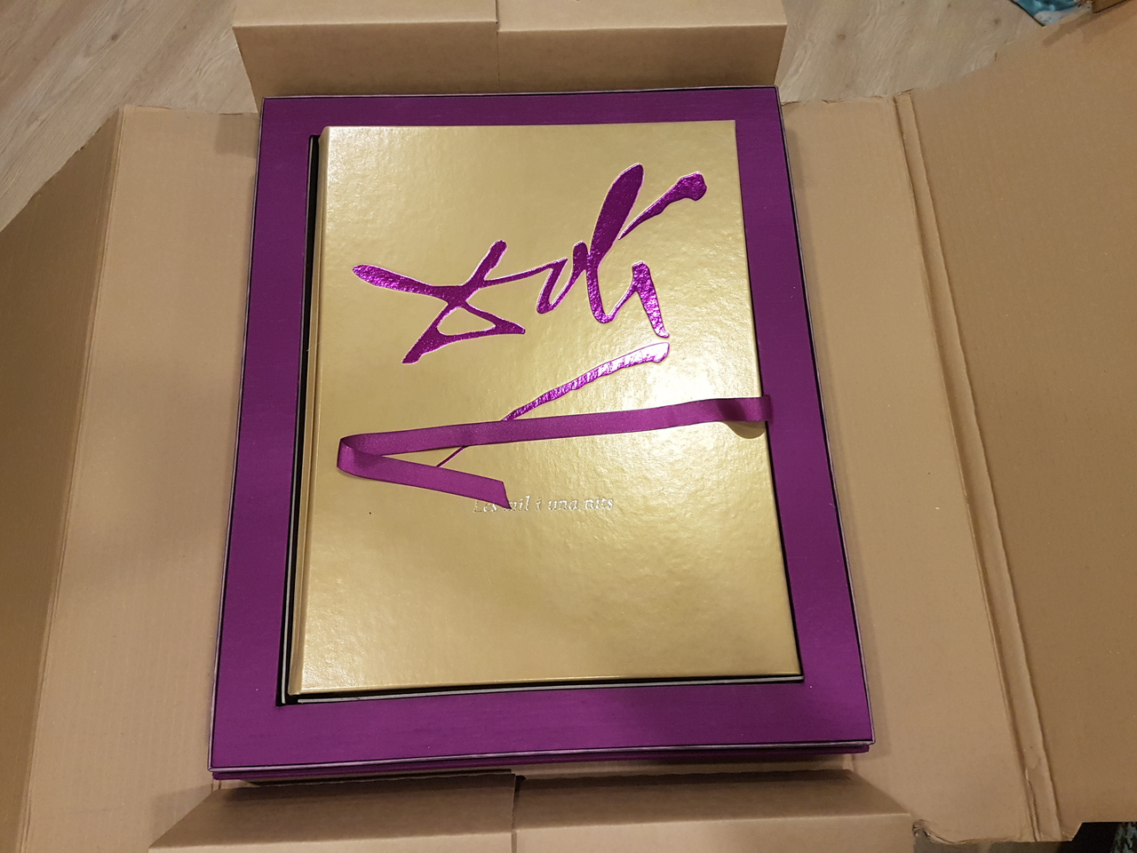 Книга библиофила представлена в коробке, облицованной шелковистой гранатовой обложкой, в которой содержится том с 50 иллюстрациями, воспроизведенными в том же размере, что и оригинал.