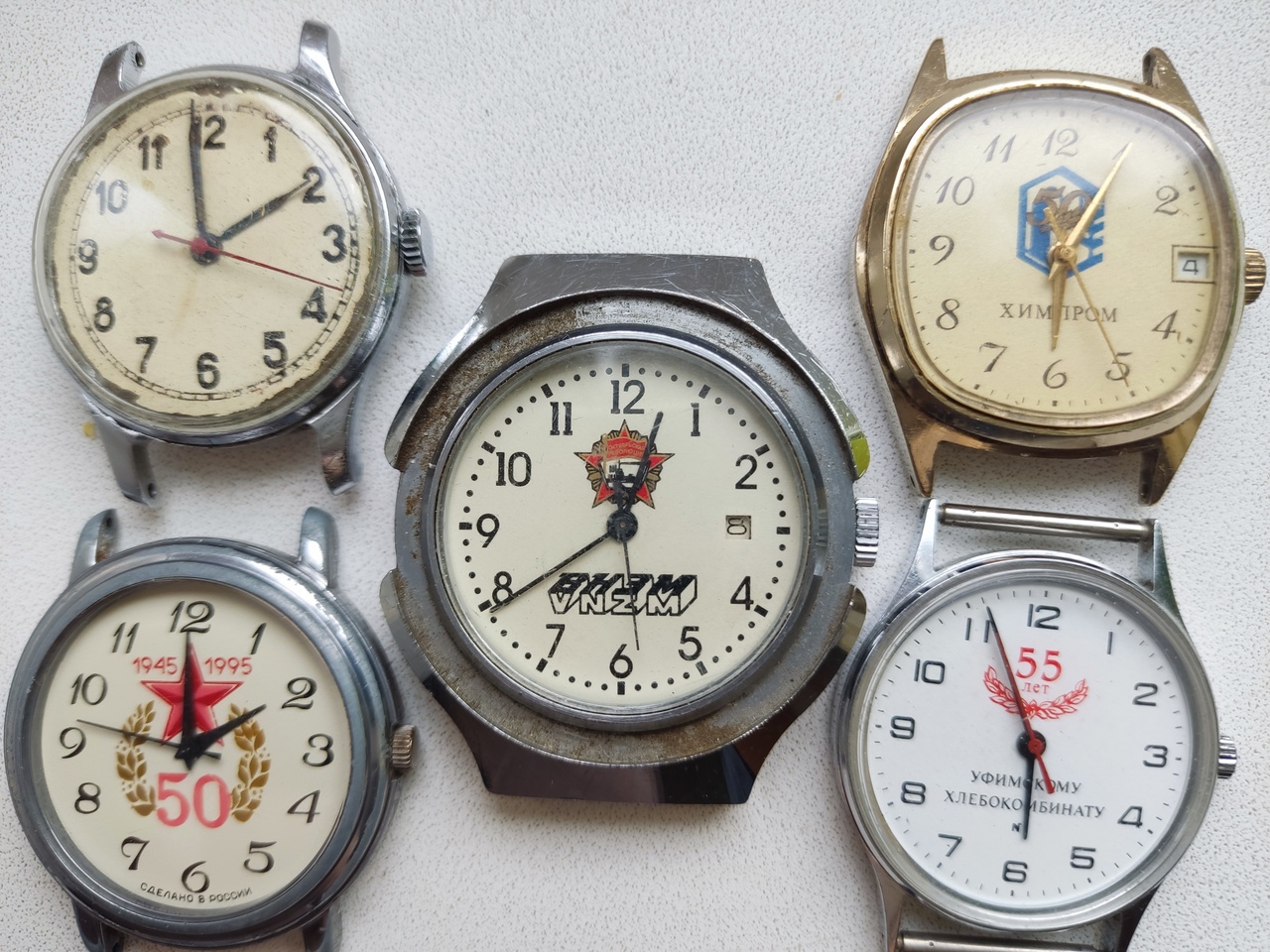 Прошу помощи в оценке часов неизвестных марок: все часы б/у,на ходу только часы с надписью химпром и 55 лет хлебокомбинату,остальным часам требуется ремонт.