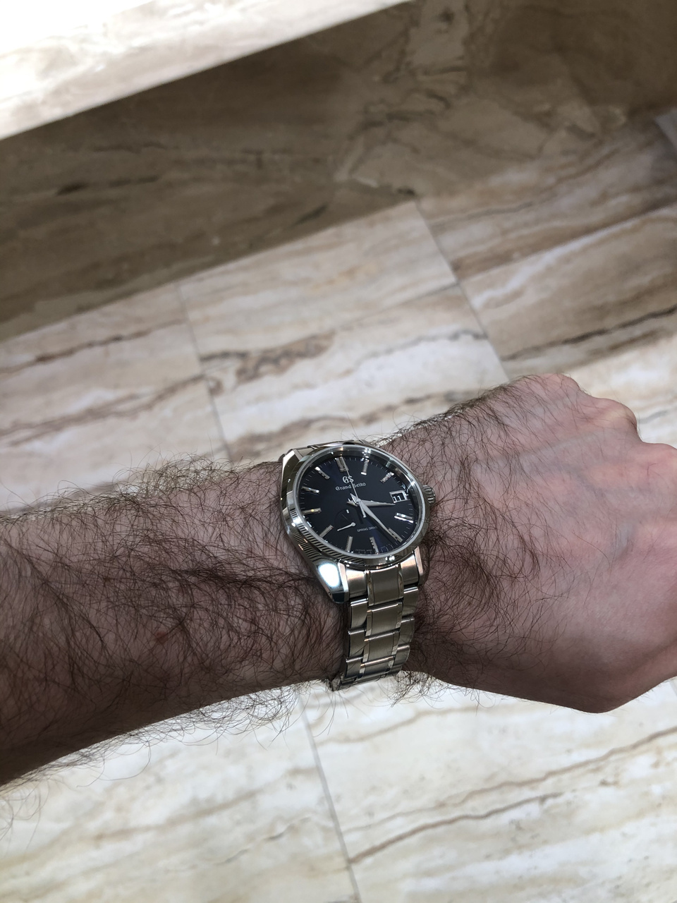 Циферблат темно-синего цвета, максимально приближенный к черному оттенку. Ручная полировка Grand Seiko Zaratsu.