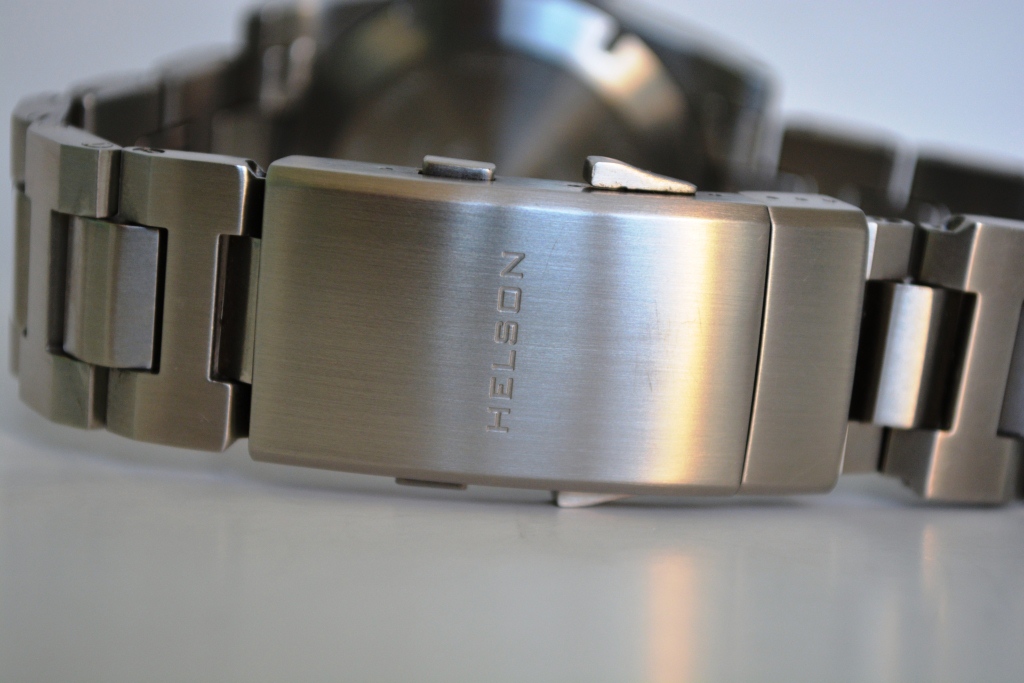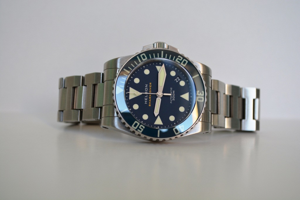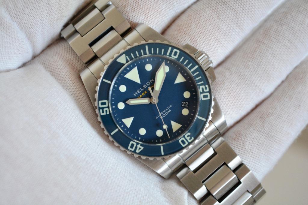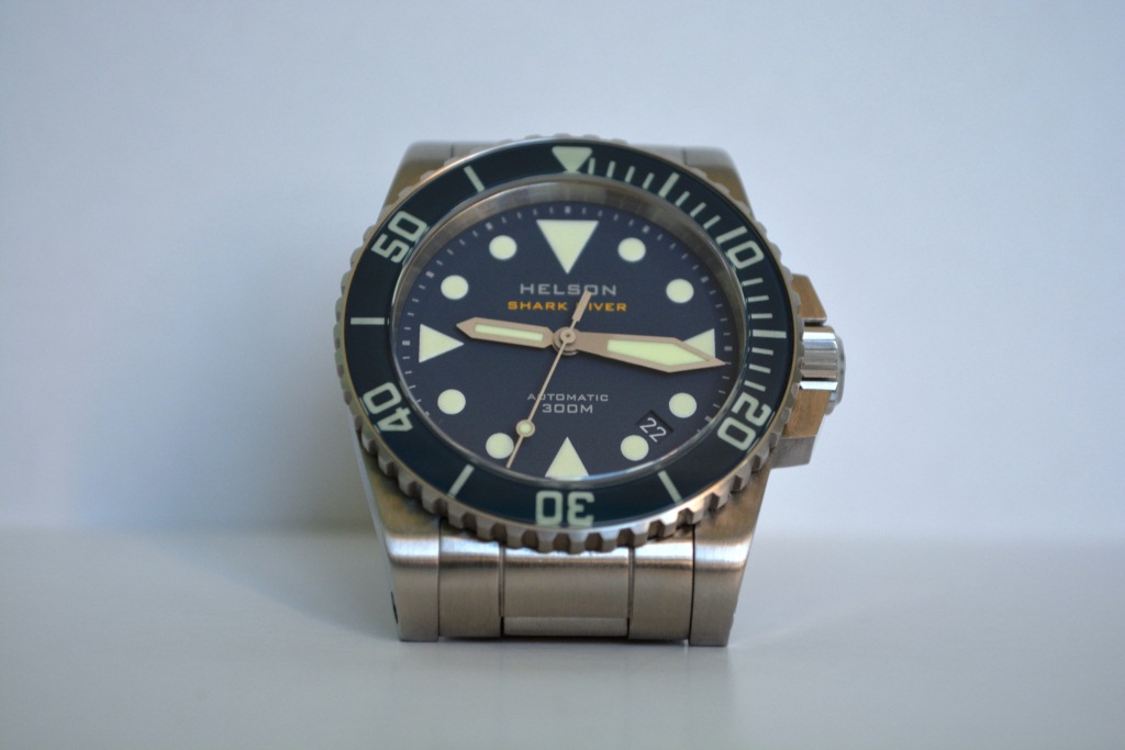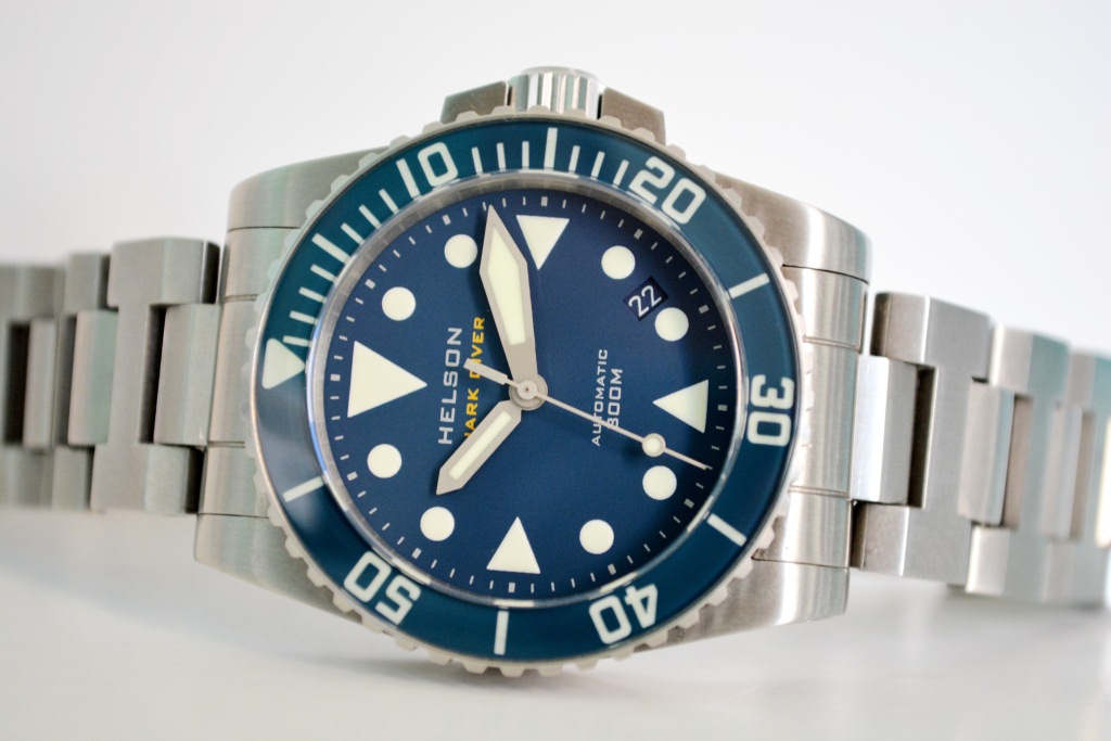 Синий циферблат с крупными люминесцентными стрелками и метками (SuperLuminova). Окошко даты.