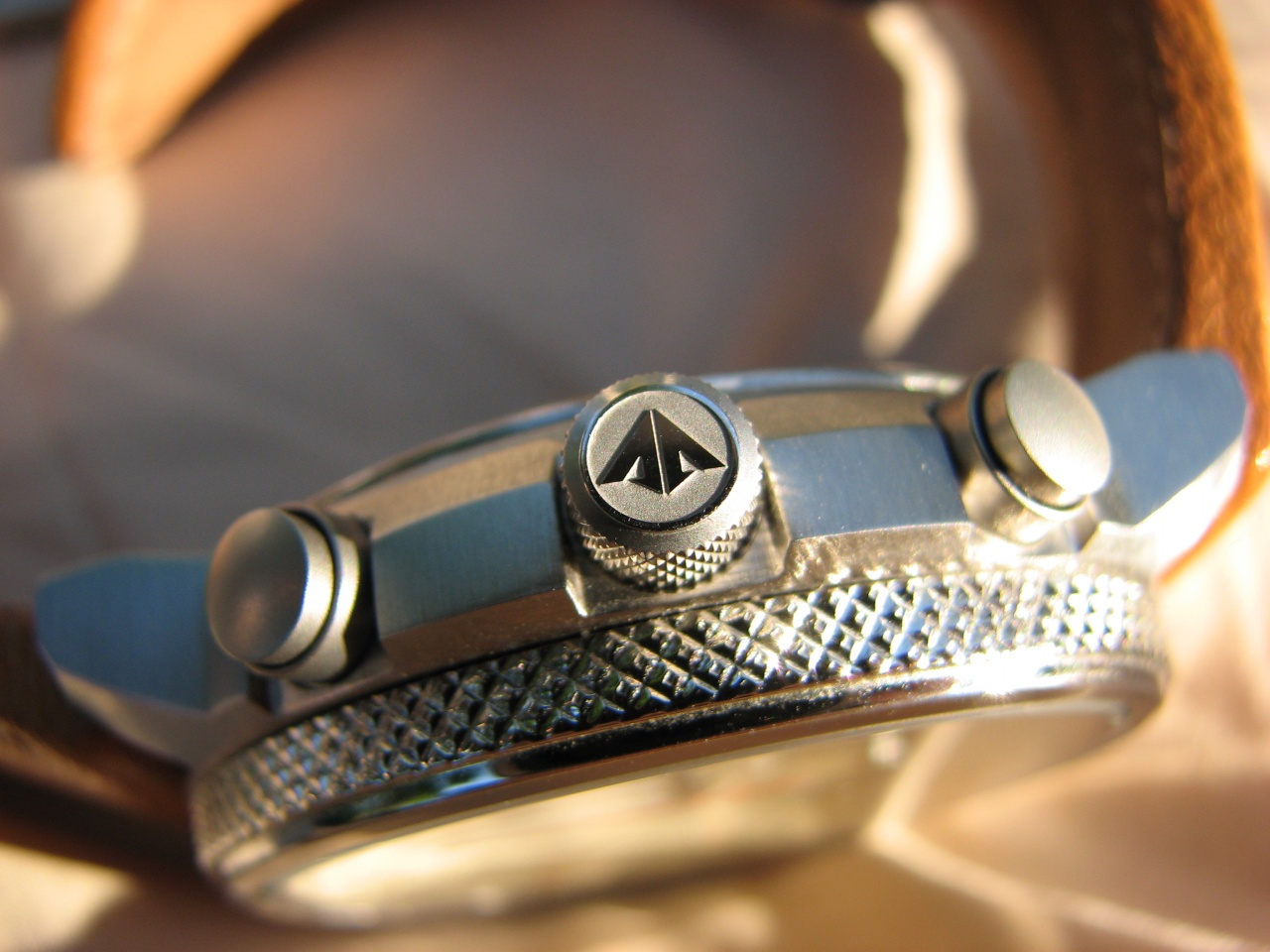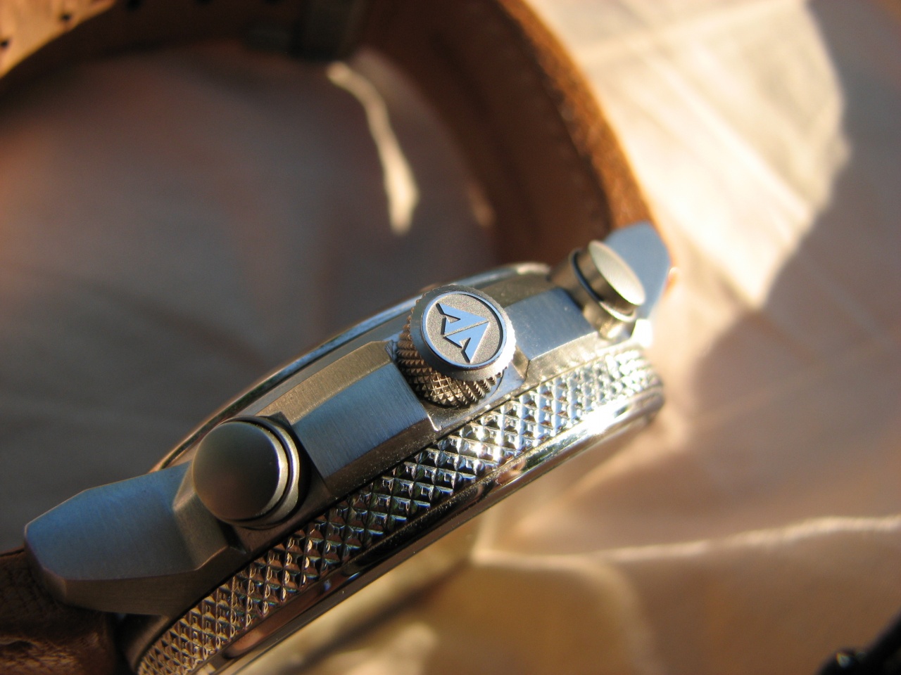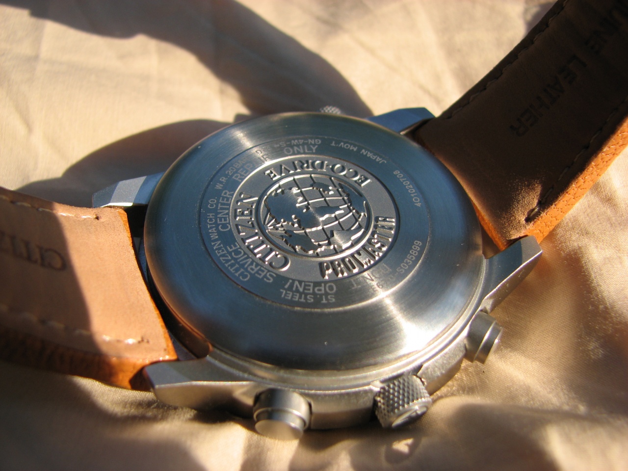 Обработка мелких деталей на высоте, под солнечными лучами вспыхивают маленькими зайчиками разные риски и окантовки субциферов. Заводная головка имеет приятную насечку для захвата пальцами и значок Promaster, головка логарифмической линейки на 8ч - просто гладкая. Задняя крышка имеет красивую глубокую гравировку. Единственное опасение вызывают кнопки, зазор между пушером и гильзой явно располагает к попаданию туда грязи и пыли. Безель - полировка, стекло на одном с ним уровне и занимает визуально всю поверхность. Как по мне - удачное решение, часы смотрятся миниатюрнее своих размеров, но полировка неизбежно соберет паутинку мелких царапинок.