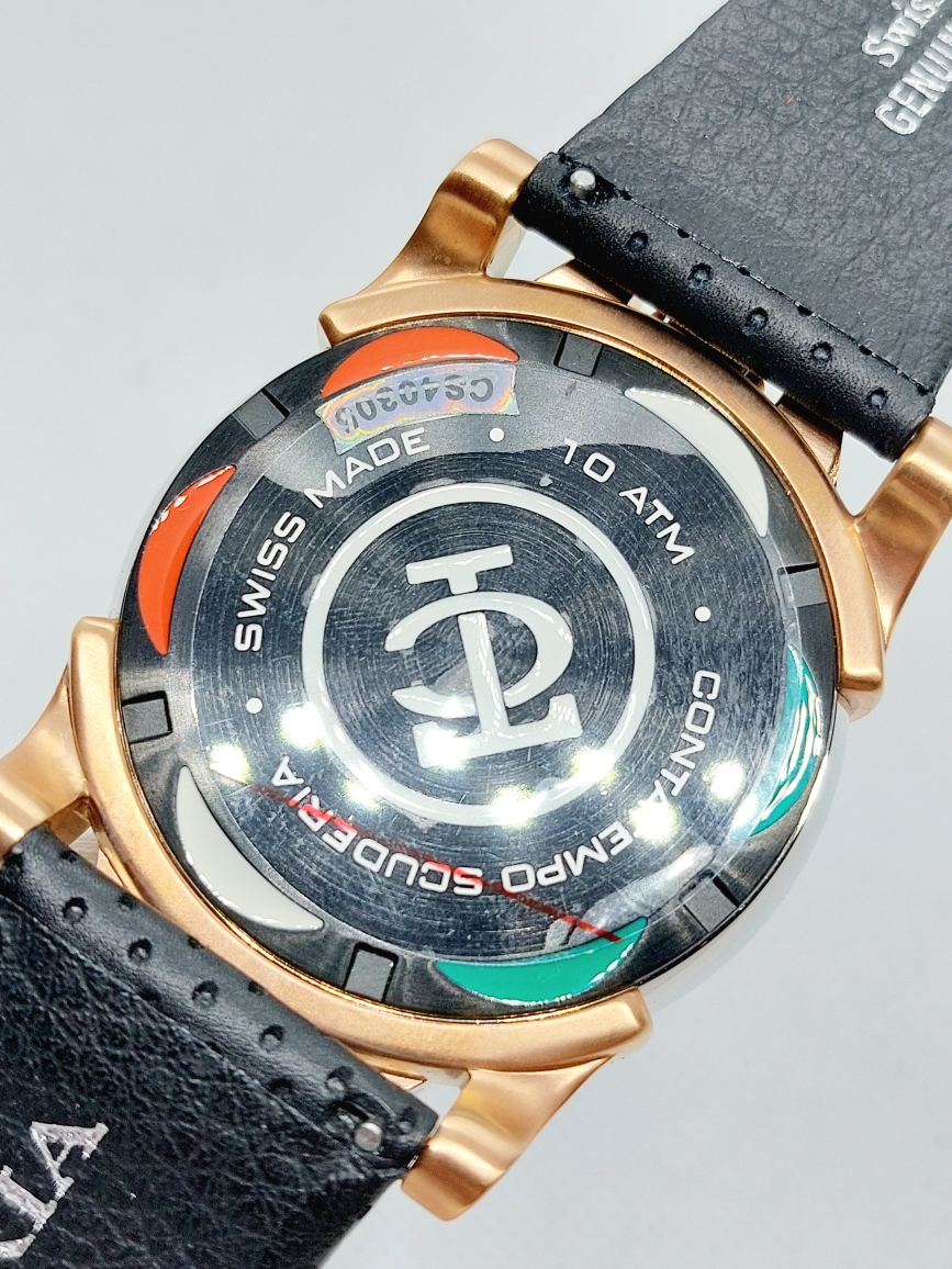 Глухая завинчивающаяся задняя крышка изготовлена из стали черного цвета, с элементами декора цветов итальянского флага, по центру которой изображен логотип и информация по кругу.