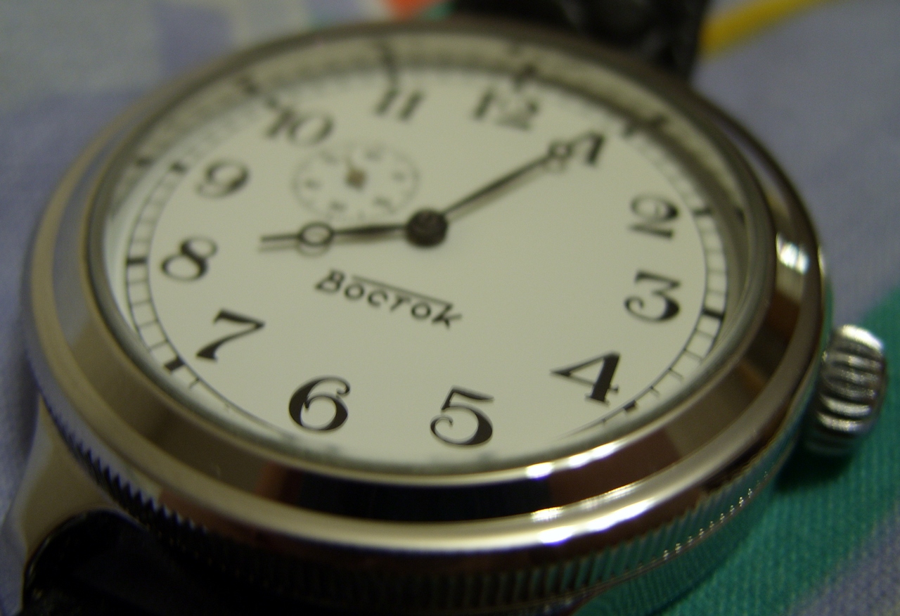 Читал и про Востоки, и про китайские корни Волмакса, и про особую любовь форумчан к японцам в случае, если бюджет покупки колеблется в районе 200$, и про Panerai почитал. Со временем у меня «сложились» вкусы, я чётко знал, что именно я хотел. Непременно русские часы, механика (ручка предпочтительней, но и против автомата ничего не имею против), белый циферблат, стрелки с яблоками Бреге, не хронометр, достаточно массивный размер, глухая, а не прозрачная задняя крышка, предельно лаконичный дизайн циферблата без даты и прочих мелочей, ремень, а не браслет.
