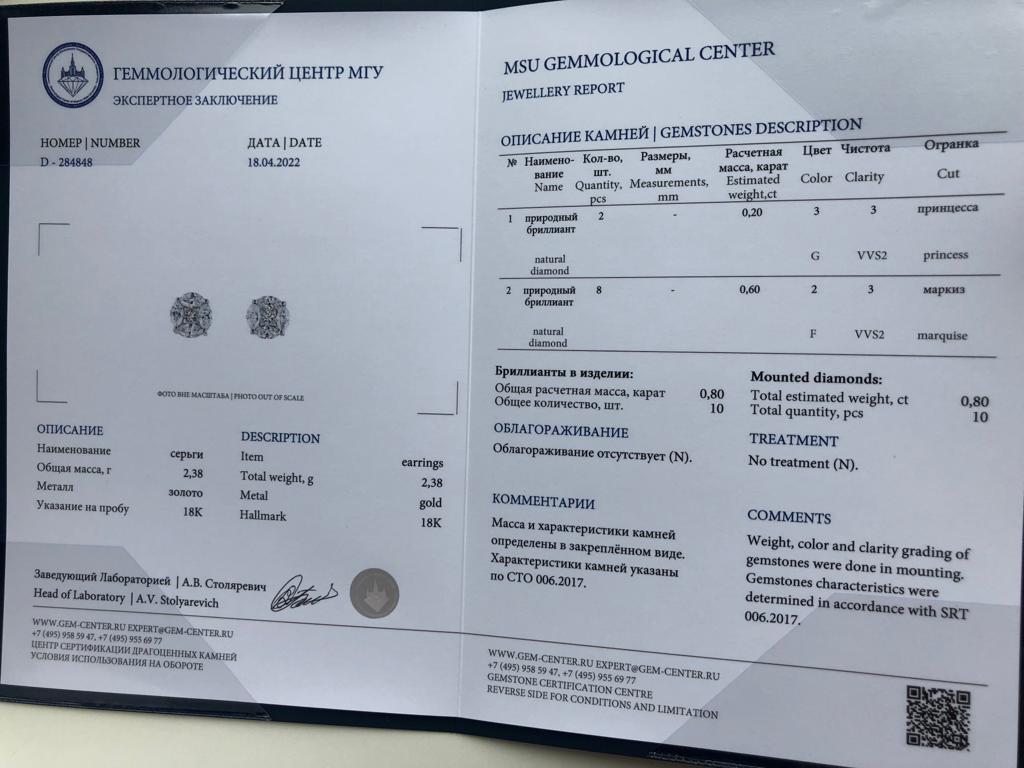 Серьги-пуссеты белое золото с бриллиантами 0.80ct VVS2 новые (сертификат МГУ) недорого