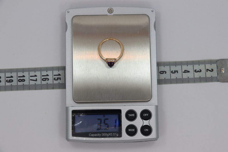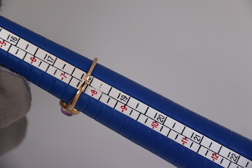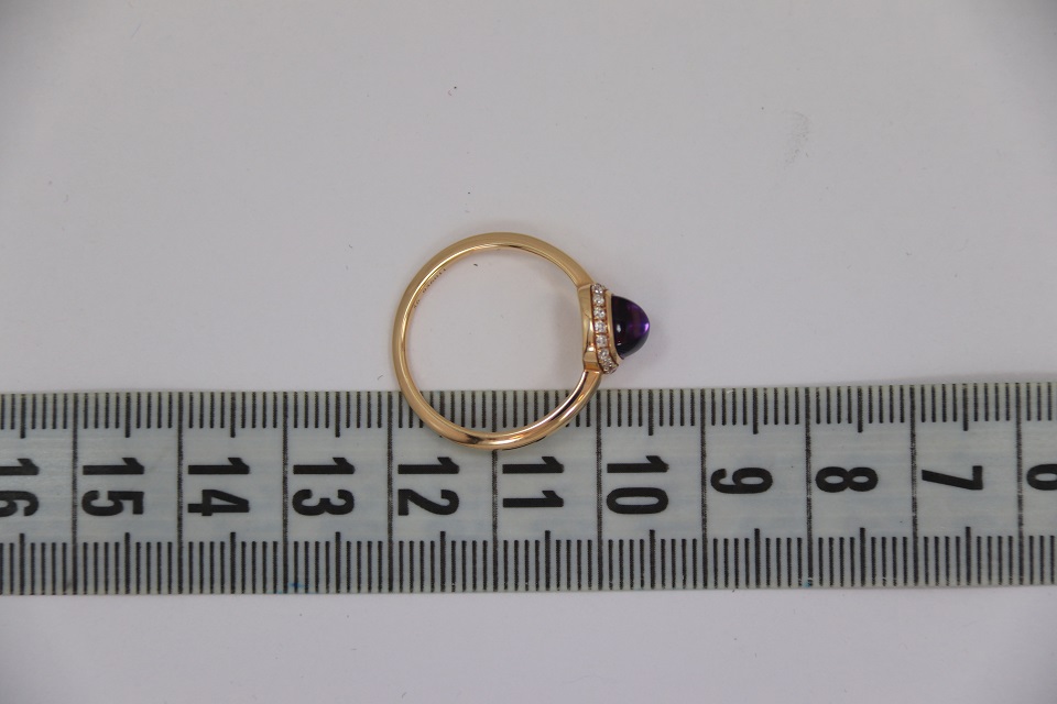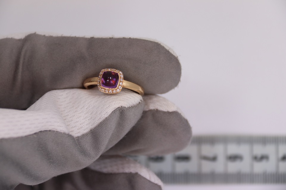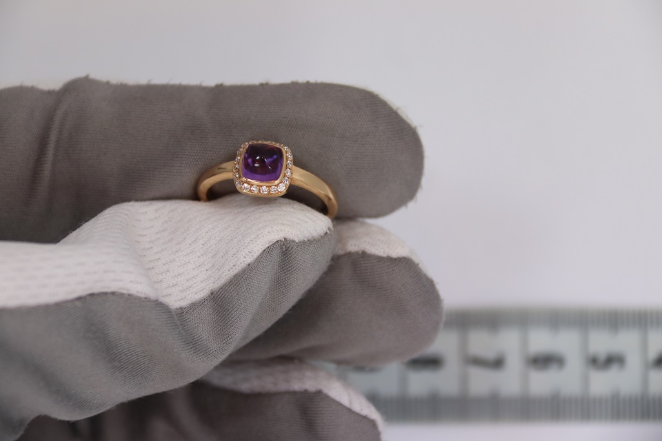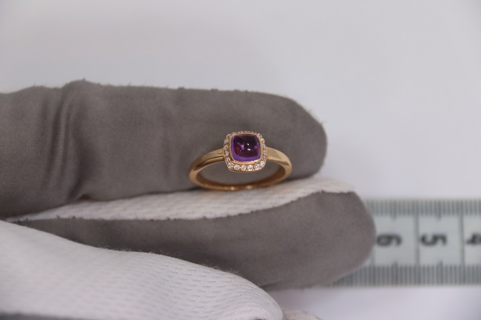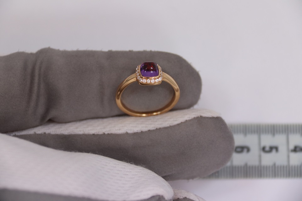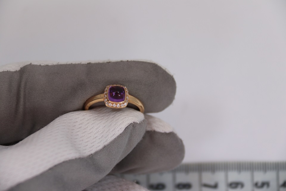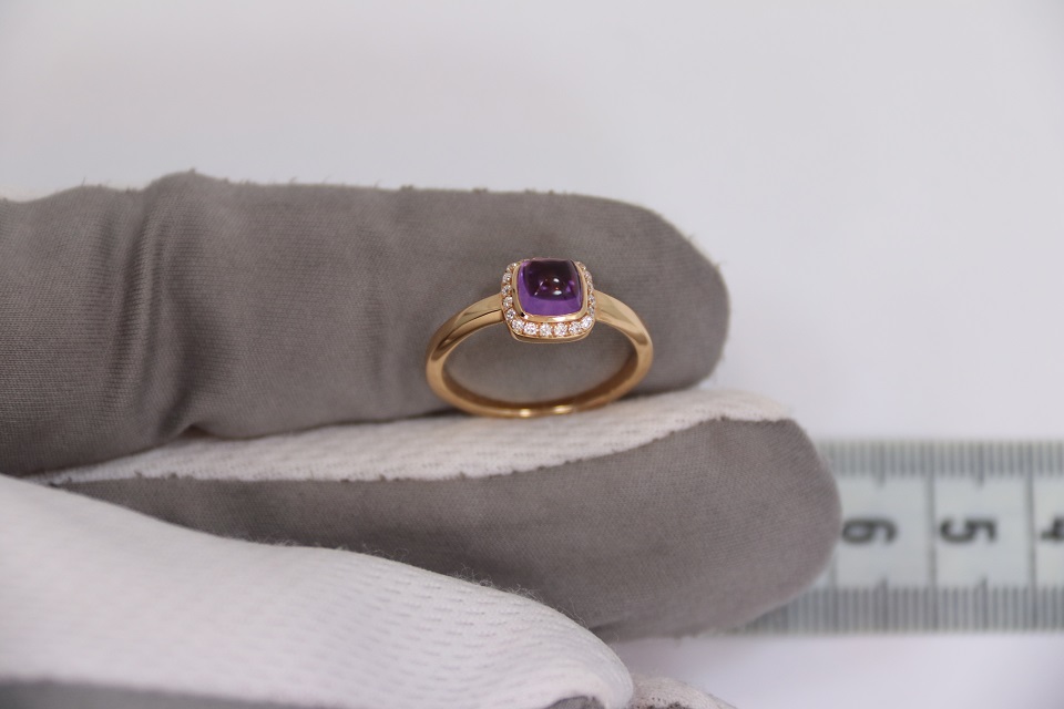 Неспешно продается новое женское золотое бриллиантовое кольцо из 18к розового золота, с бриллиантами и аметистовым кабошоном