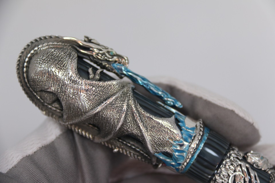 Колпачок ручки - настоящий образец ювелирного искусства - сделан в виде фигуры дракона, а клип ручки стилизован в виде головы Визериона с устрашающими клыками и потоком ледяного пламени, вырывающегося из его открытой пасти.