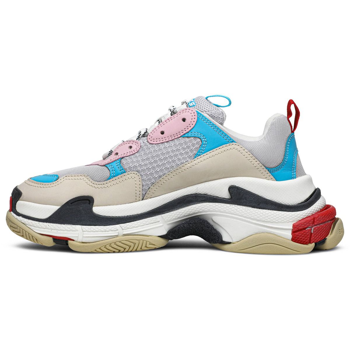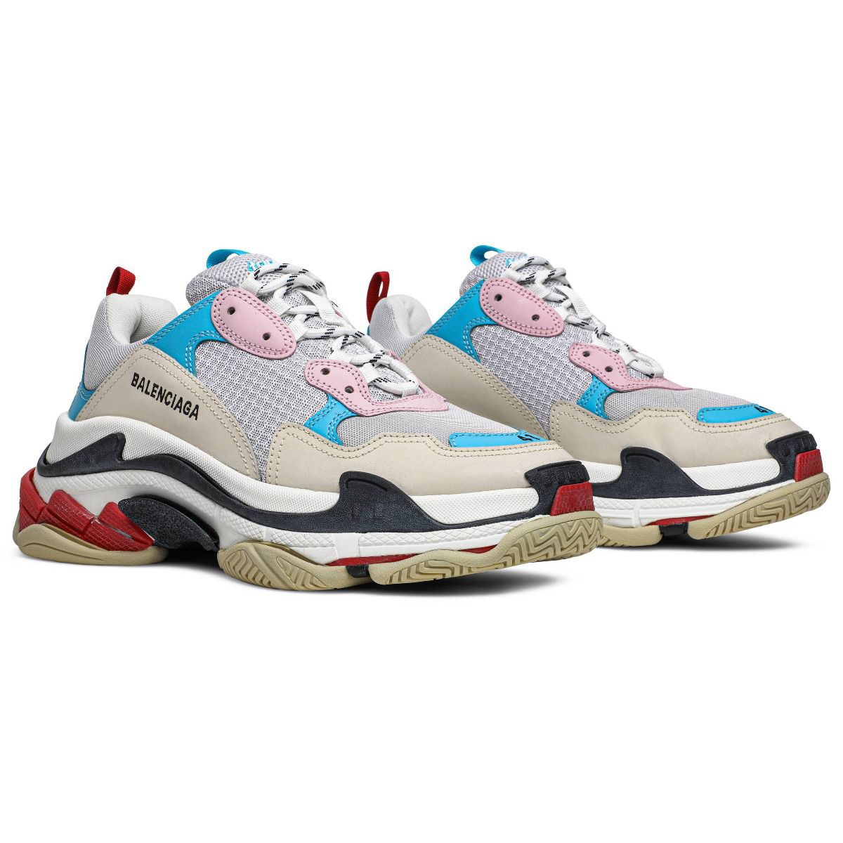 "Демна Гвасалия не устает экспериментировать с цветовой палитрой кроссовок Triple S. На этот раз модель знаковых для марки Balenciaga кроссовок выполнена в сочетании песочно-бежевого, бирюзово-синего и розового цветов, с характерной для модели многослойной скульптурной подошвой в черных, белых, бежевых и бордовых тонах. Боковые панели традиционно украсили логотипом бренда, основанного Кристобалем Баленсиагой."