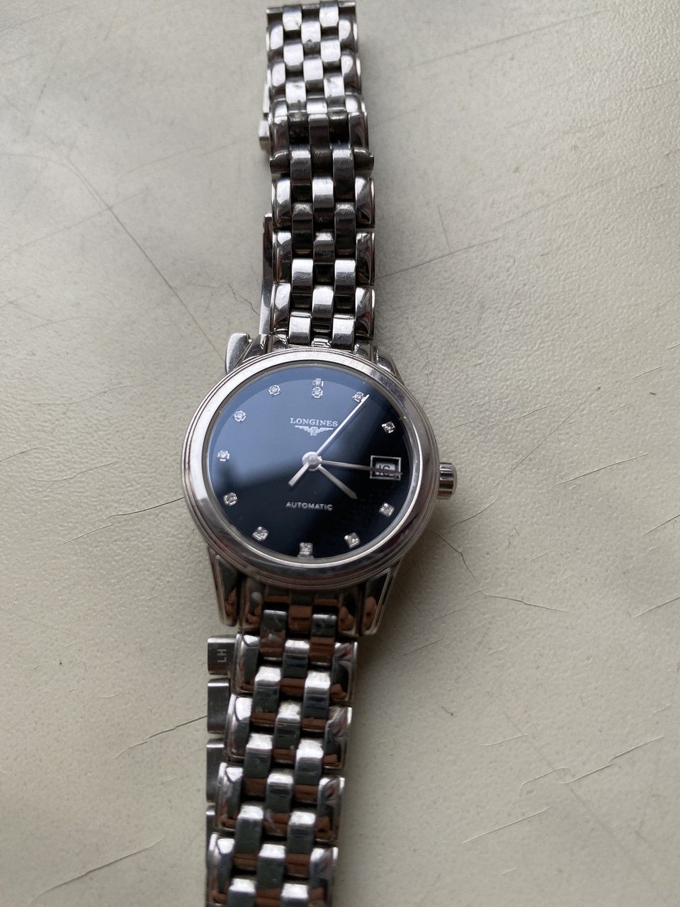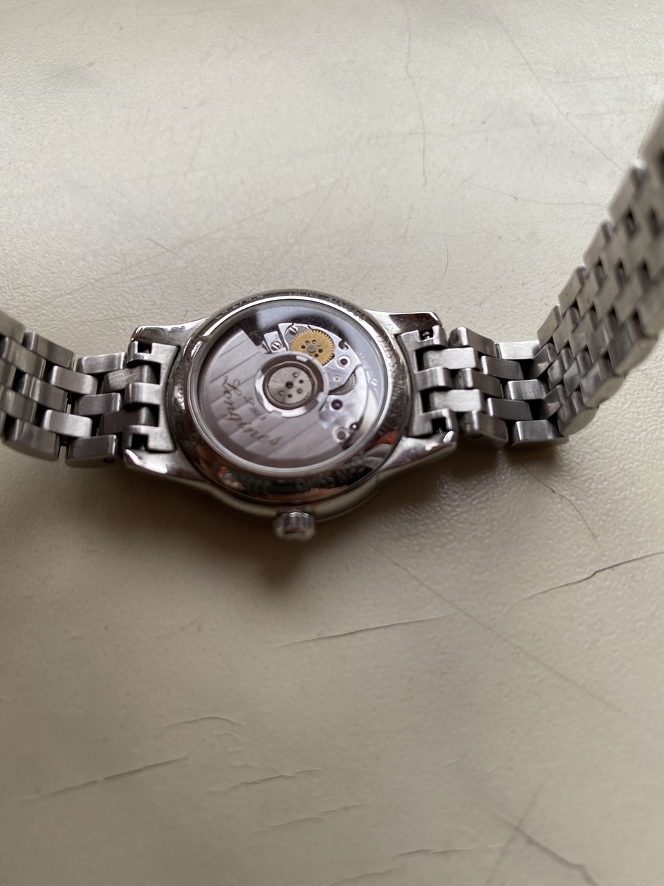 Механические часы с автоподзаводом. Калибр L595. Корпус из нержавеющей стали. Сапфировое стекло. Циферблат черный. Браслет из нержавеющей стали. Водонепроницаемость при давлении 3 атм. Дата. На циферблате 12 бриллиантов 0,06К. Прозрачная задняя крышка. Диаметр корпуса 26 мм. Покупались в Швейцарии в 2007 году, не носились.