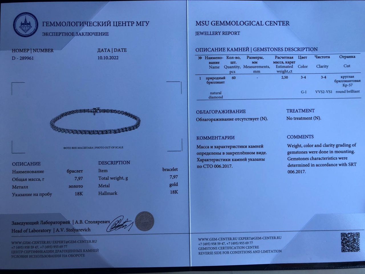 Браслет белое золото с бриллиантами 2.50ct новый (сертификат МГУ) недорого