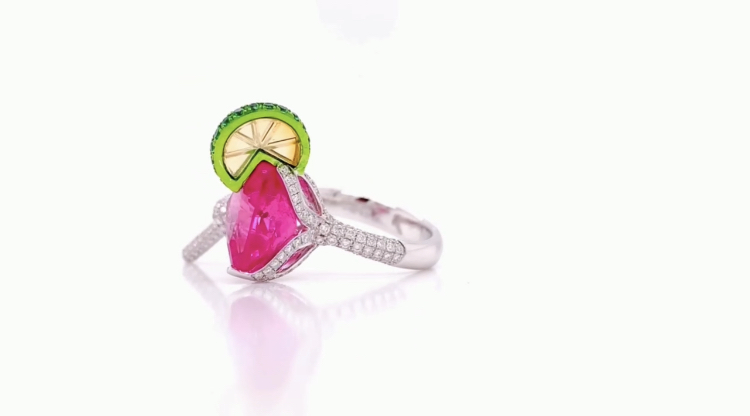 Вашему вниманию предлагаем приобрести эксклюзивное коктейльное кольцо выполненное из 18к белого золота, усыпанного брильянтами (1,066Ct) с центральным рубиновым турмалином (4,26Ct), а также зелёным цаворитом (0,17Ct) в виде кусочка лайма. Очень красивое и оригинальное кольцо! Видео по запросу.