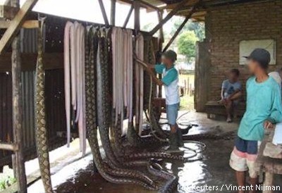Варанов, например, связывают, и, заткнув им пасть, забивают до смерти, прежде чем снять ценную кожу. Питонов же разделывают и обдирают еще более диким способом - живьем.