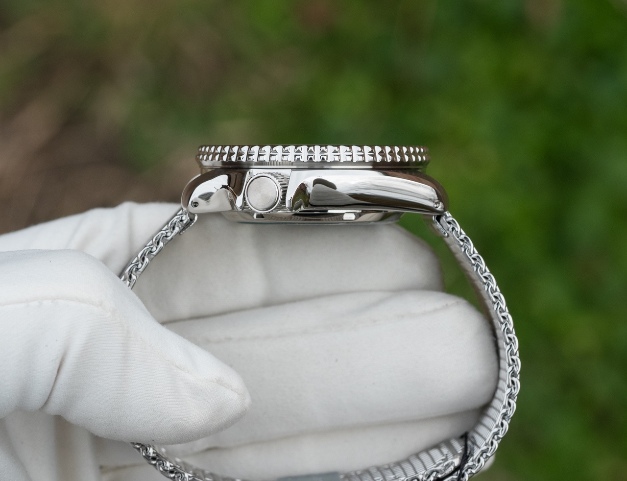 Стальной корпус, сатин + полировка, защитные наплывы у заводной головки