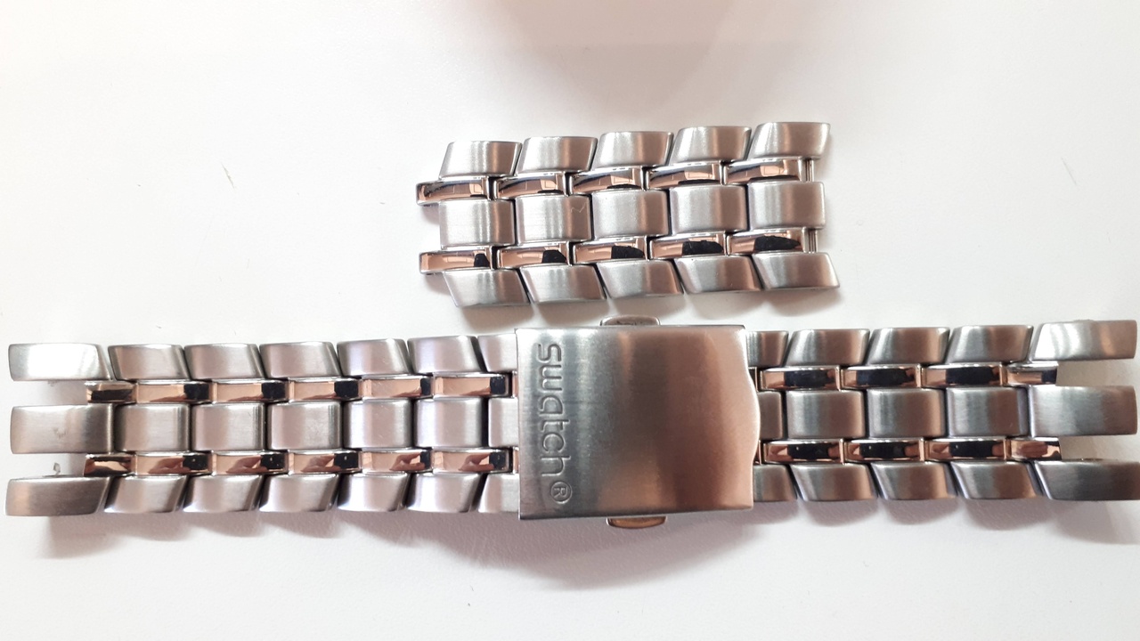 Браслет укорочен на запястье 18,5 мм, имеется 2 запасных звена, а также запасные пины для его замены.