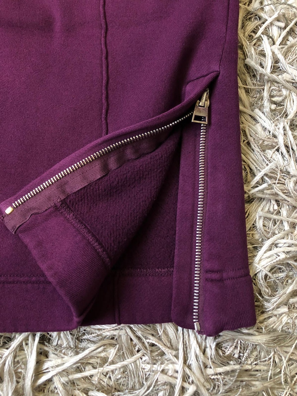 Брюки прямого кроя с фактурными,имитирующими стрелки швами,выполнены в спортивном стиле.Модель винно-пурпурного цвета изготовили из мягкого хлопкового трикотажа,что придаёт комфорт владельцу.Широкий пояс с кулиской,с помощью которого удобно регулируется посадка,крупные накладные карманы сзади,потайные молнии на низе брючин характеризуют данное изделие,идеально подходящее для путешествий и повседневной носки.