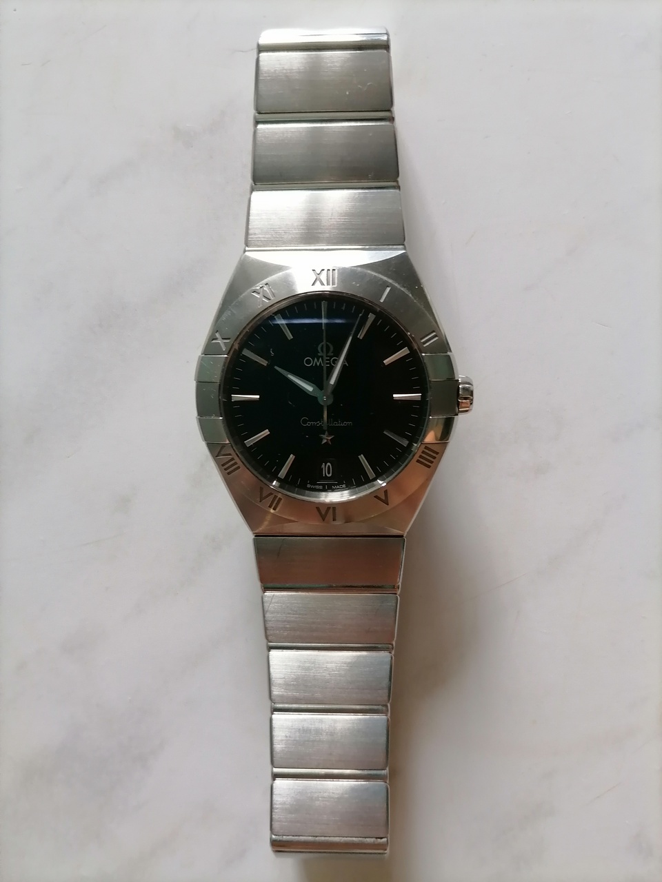 Модель из нержавеющей стали имеет корпус диаметром 36 мм, безель с выгравированными римскими цифрами, черный циферблат с радиальным сатинированием и окошком указателя даты в положении "6 часов". Стрелки, логотип OMEGA, звезда Constellation и индексы выполнены из 18-каратного белого золота.