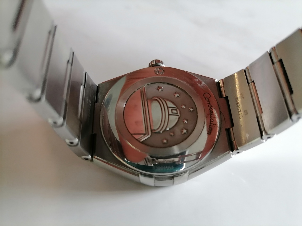 В часы установлен механизм OMEGA 4564, а их заднюю крышку с вертикальным сатинированием украшает рельефный медальон с изображением обсерватории