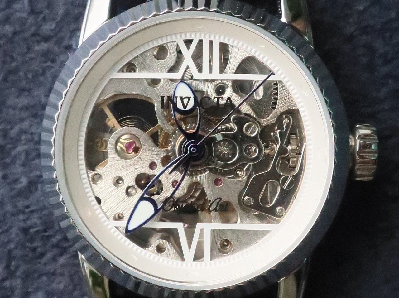 • Механизм — китайский PTS 2650 на 20 камнях. Насколько я понимаю, это “стандартный механизм”: потомок тех, кто разработали в 1970-х ради стандартизации часопрома в Китае (раньше многочисленные фабрики делали механизмы кто во что горазд). Говорят, “стандарты” не блещут точностью, зато надежны — если сделаны не “у дядюшки Ляо”, а на заводе. Для Invicta механизмы поставляют с проверенных заводов, и проблем быть не должно.