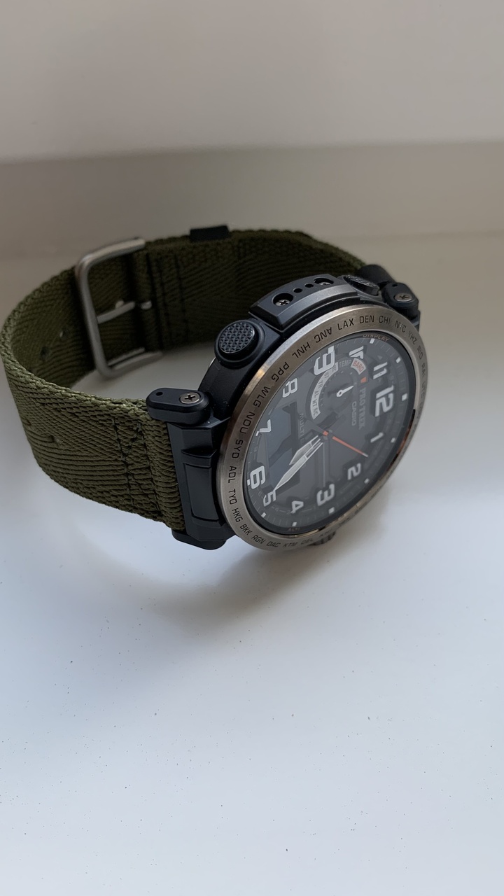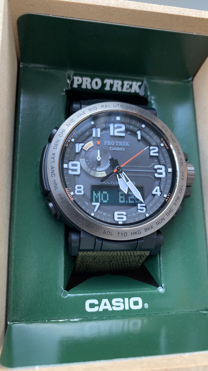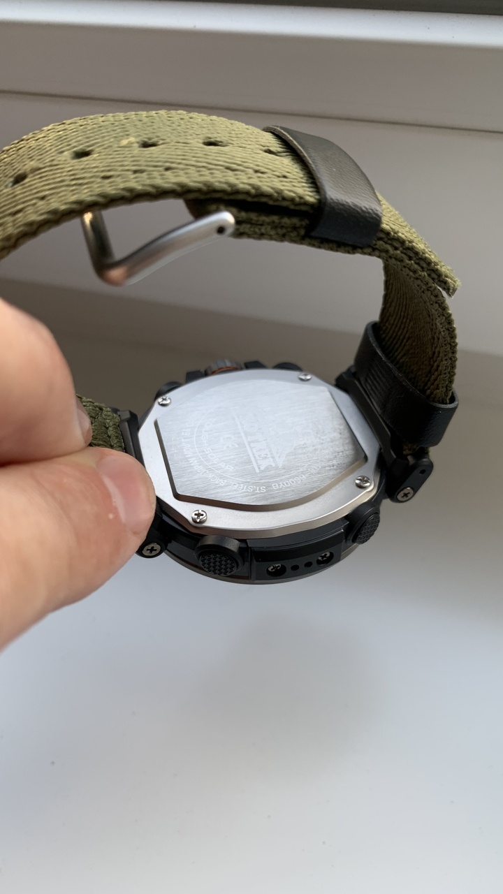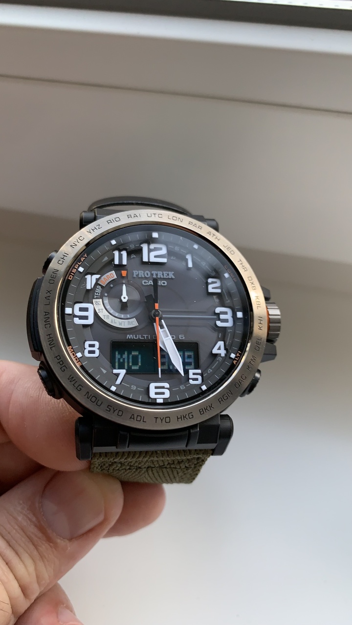 Кварцевые часы. Солнечная батарея. Индикатор заряда батареи. Функция энергосбережения. Светодиодная подсветка. Коррекция текущего времени радиосигналом на территории почти всей Европы, США, Японии и Китая. Мировое время. Функция установки летнего времени. Секундомер с точностью 1/100. Таймер обратного отсчета с возможностью настройки от 1 минуты до 1 часа. 5 будильников ( 1 с функцией повтора). Ежечасный сигнал. Включение/выключение звука кнопок. Автоматический календарь (до 2099 года). Цифровой компас определяет северный магнитный полюс. Альтиметр (высотометр) с диапазоном измерений: -700 до 10000 м (-2300 к 32,800 футов). Единица измерения - 1 м (5 футов). Память до 40 записей, каждая из которых включает данные о высоте, дате и времени. Барометр с диапазоном измерений: 260 к 1100 hPa. Термометр с возможностью измерения от -10 до 60 C (от 14 до 140 F). Устойчивость к низким температурам (–10C/14F). Автоматическая ручная настройка. Функция перемещения стрелок. 12/24х часовой формат времени. Корпус выполнен из полимерного материала. Размеры корпуса 51,6 × 51,5 × 13,6 мм. Текстильный ремешок.