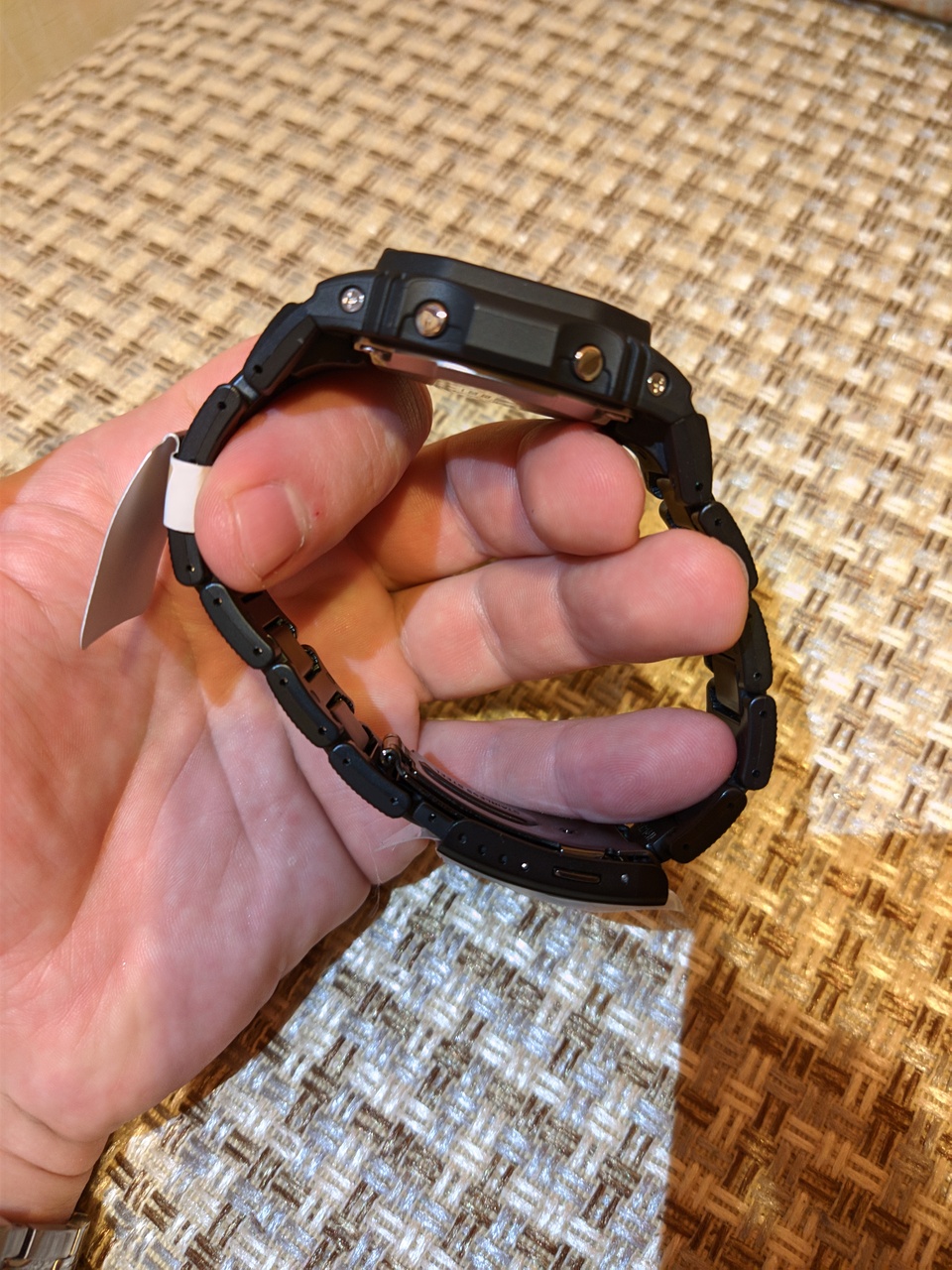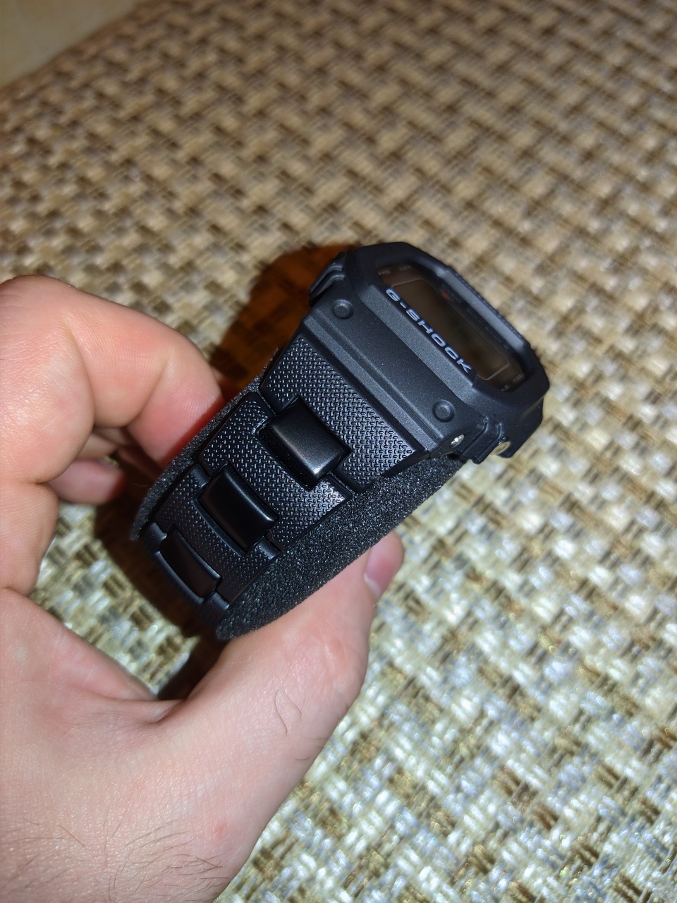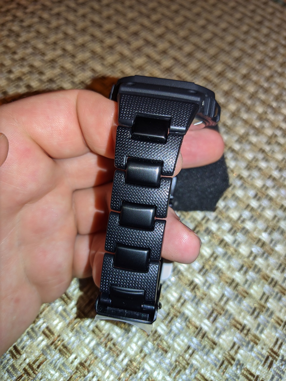 - Композитный браслет, гораздо удобнее и практичнее чем стандартные ремешки, к тому же придает ещё больше брутальности и солидности часам. Идеальное соединение с корпусом, без зазоров, выглядит как одно целое. Текстура на звеньях браслета рисунком повторяет таковую на дисплее часов.