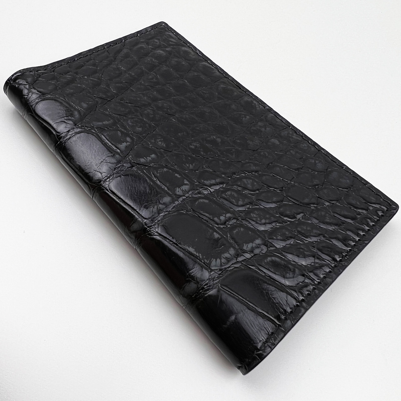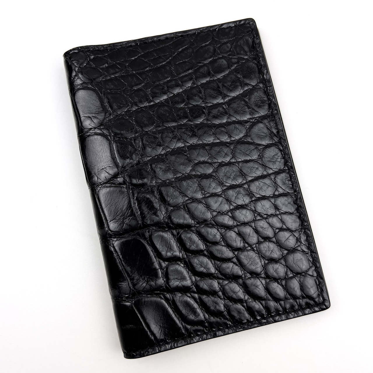 Особенность модели. Обложка выполнена из кожи крокодила, и окрашена в черный цвет. Затем мастера вручную с использованием специального инструмента немного "затирают" краску, создавая винтажный потертый эффект. Но это не все - далее получившееся полотно также вручную длительно полируется натуральным полировочным камнем, чтобы придать коже на всей площади (и там где она окрашена и там где краска как бы "потерта") одинаковую гладкость и равномерный естественный сатиновый блеск. То есть, никаких реальных потертостей, сдиров-шерховатостей на коже не будет: неоднородность окраса в готовом изделии является именно декоративным эффектом, на ощупь же кожа равномерная, с приятным мягким сатиновым блеском, и достигается этого именно ручной полировкой а не покрытием кожи лаком.