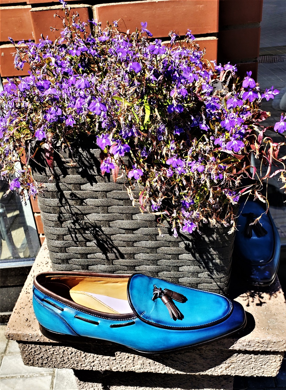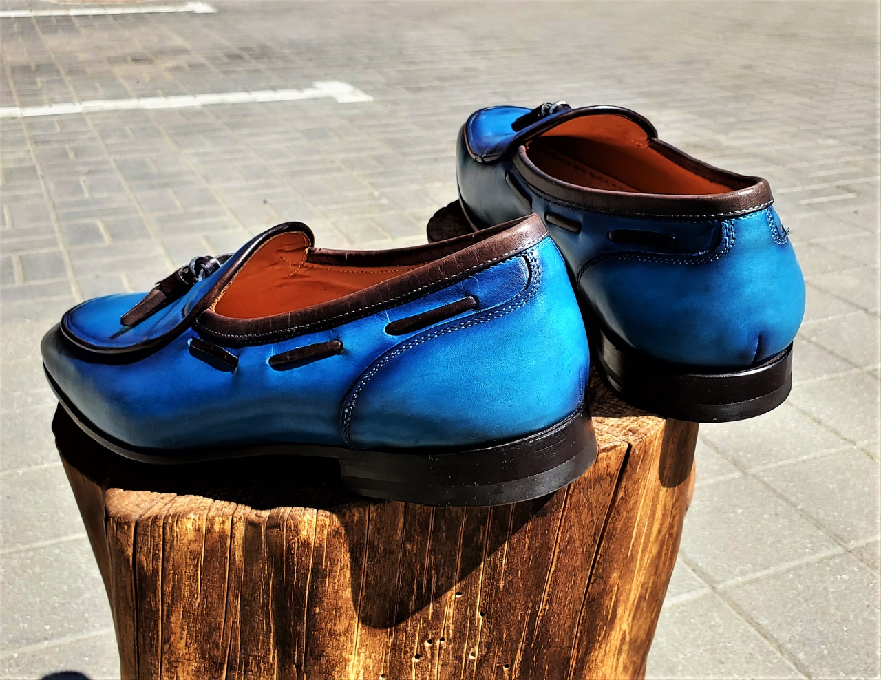 Изготовлены из комбинированной 100% телячьей кожи высочайшего качества выделки, окрашенной полностью вручную в «лазурный синий» цвет с эффектом патинирования «антик».