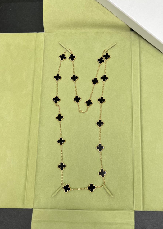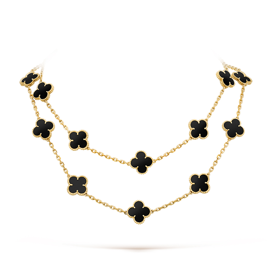 Необыкновенно восхитительный дизайн длинного колье Vintage Alhambra, 20 мотивов, VCARA43100, имеет легко узнаваемый стиль коллекции Alhambra от 1968 года знаменитого бренда Van Cleef and Arpels. Модель длинного колье состоит из элегантной цепочки, длиной 84 см, усыпанной вставками листиков очаровательного клевера из солидного оникса.