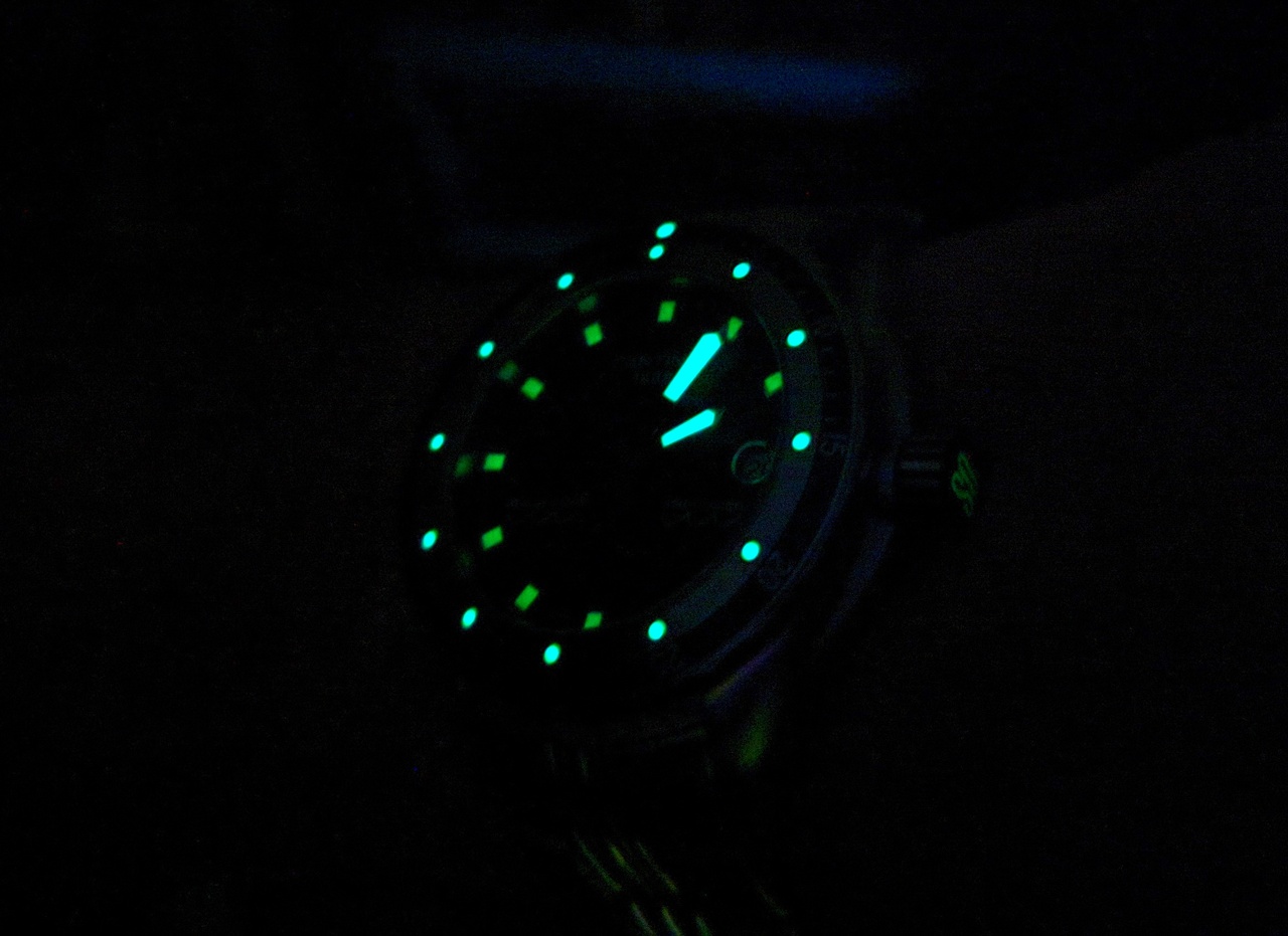 Шикарный яркий люм, на метках, стрелках, на безеле и заводной головке.