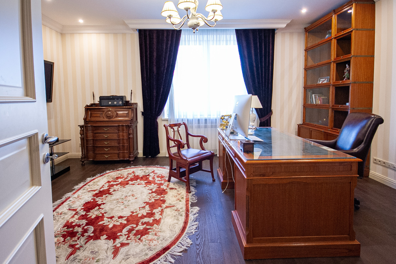 Кабинет: полы - паркетная доска из натурального дуба, мебель из массива дуба, в кабинете есть большая гардеробная, шкафы для книг и документов, в гардеробной есть сейф для стрелкового оружия. Кабинет спокойно трансформируется в детскую комнату.